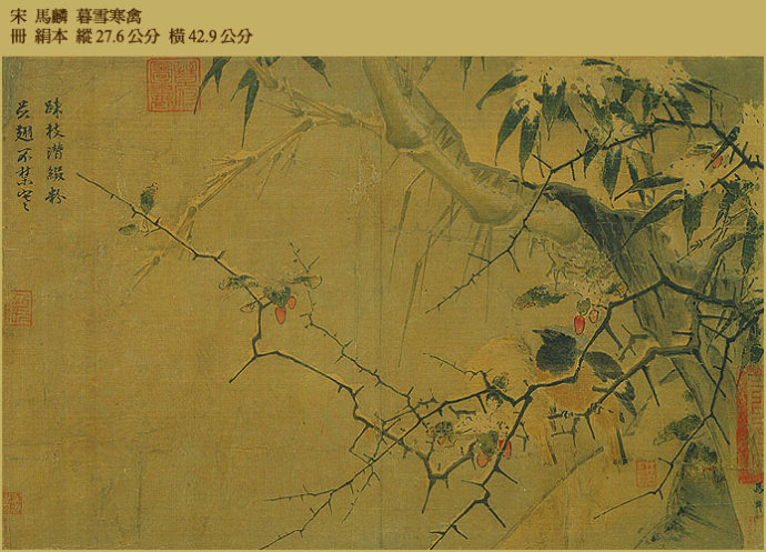 马麟(公元13世纪)〔南宋〕麟一作驎,原籍河中(今山西省永济),南渡后三代居钱塘,遂为钱塘(今浙江省-杭州市)人。马世荣之孙,马远之子,生卒年不详。马远是宋光宗、宋宁宗两朝(1190-1224)画院待诏,马麟画承家学,擅画人物、山水、花鸟,用笔圆劲,轩昂洒落,画风秀润处过于乃父。宁宗嘉泰(1201-1204)间授画院祗候,颇得宁宗赵扩、恭圣皇后杨氏及杨妹子(娃)称赏,每于父子画上题句。在《层叠冰绡图》中题诗云:“浑如冷蝶宿花房,拥抱檀心忆旧香。开到寒梢尤可爱,此般必是汉宫妆。”《画史会要》谓:“麟不逮父。远爱其子,多于己画上题麟,盖欲其章也。”
