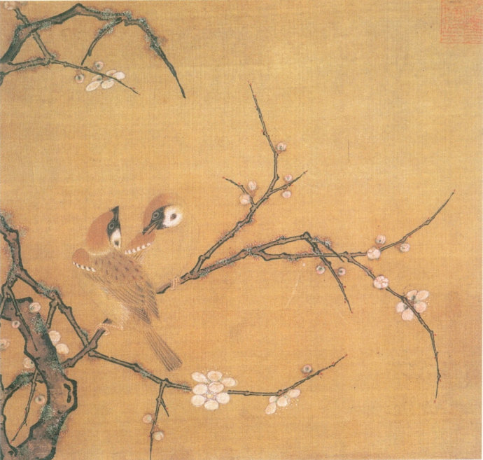 图中所画两枝梅花据称为绿萼梅,是梅花中的名贵品种。枝干细秀劲挺,花朵繁密俏媚,皆以双勾填色法绘之。画法精细,层次鲜明,枝干的转折,花朵的向背,处理得面面俱到。花瓣外沿和背面又厚施白粉加以强调,将梅花冰清玉洁、如纱似绢的姣美形象表现得极其完美。杨皇后“层叠冰绡”四字的形容恰如其分,且极富诗意,亦为此图增色不少。