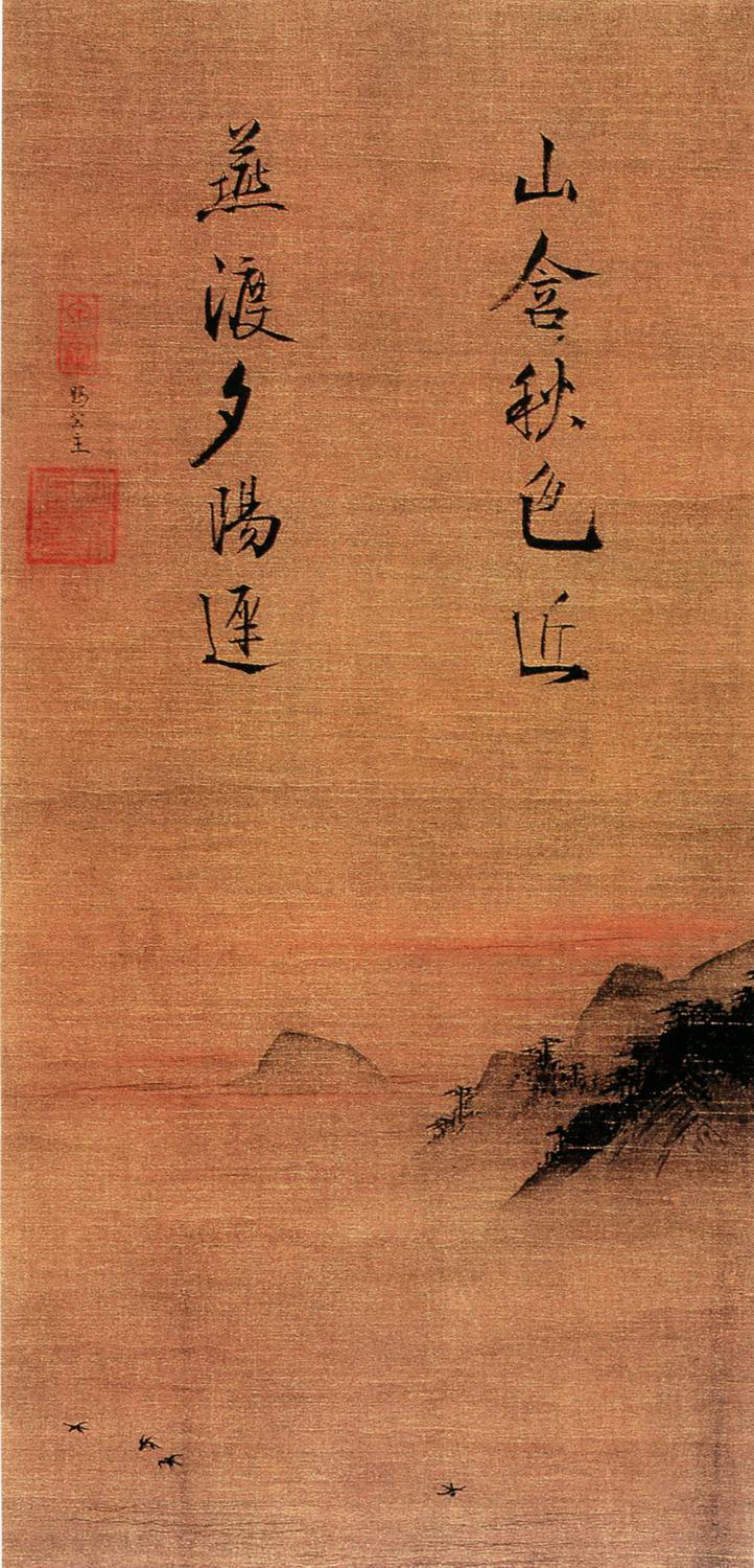 这幅作品是其代表作。画面着墨不多,且集中于下部,作者着意于秋色夕阳。远山衔日,山石树木笼罩在一片紫色云雾之中;近景水面上,四只燕子正低飞嬉戏。整个画面虽用笔不多,但意趣横溢。画幅上部题“山含秋色近,燕渡夕阳迟。赐公主”,为宋理宗所书。