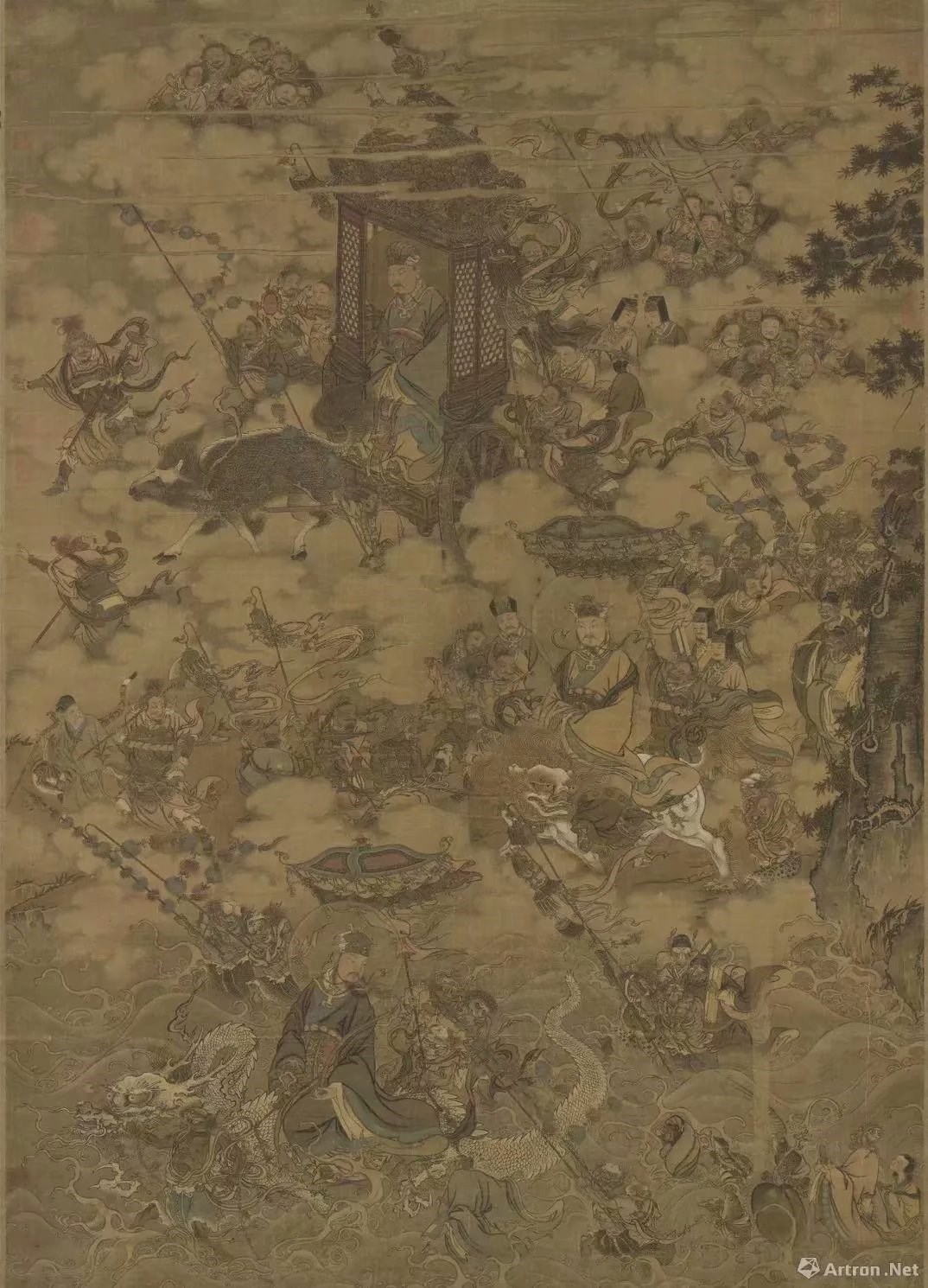 秘殿珠林续编乾清宫著录,设色画三元云驾。旌幢扈从。无名款。