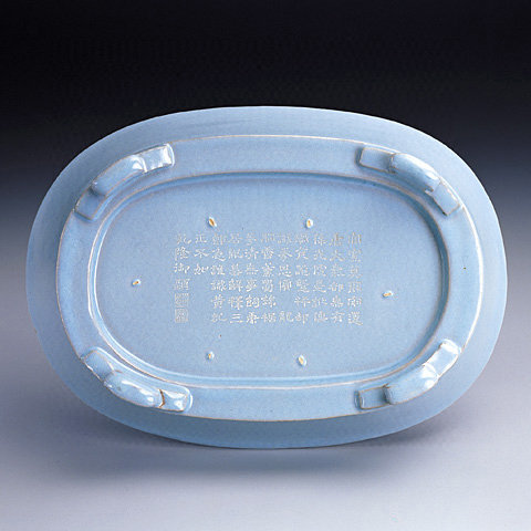 高6.9cm,横23cm,纵16.4cm,口径 23 cm,足径 19.3×12.9cm,重670g,椭圆形盆,侈口,四云头形足;周壁胎薄,底足略厚。通体满布天青釉,极匀润;底边釉积处略含淡碧色;口缘与棱角釉薄处呈浅粉色。裹足支烧,底部有六个细支钉痕,略见米黄胎色。全器釉面宁静开朗,纯洁无纹片,据考证为传世仅存的一件。