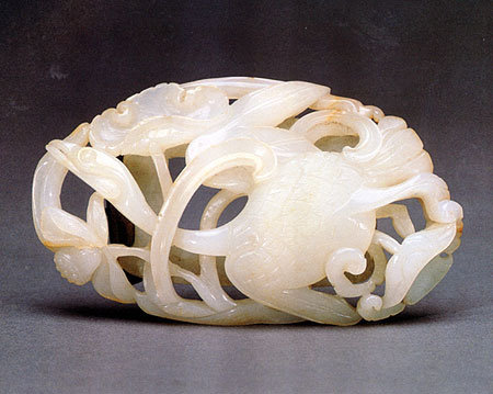 呈现大雁穿梭于河塘苇丛间的景况,塑造出线条层叠的丰富空间。背面则由铜制带扣,供穿系革带之用。这件作品既有元朝带饰的椭圆造型,又只呈现大雁而无猎鹰,可能创作于元明风格交替的时期。器近椭圆形,白玉质,光泽温润莹秀。正面采多层次镂空技法,背面,中央有一长方形框,面上浅浮雕如意云纹,框的两侧嵌有铜质带扣,以供穿系革带之用。