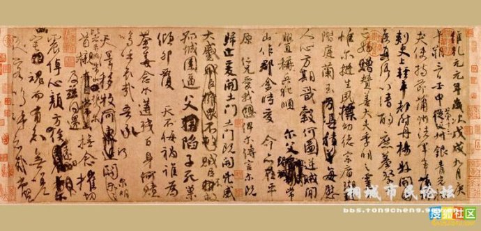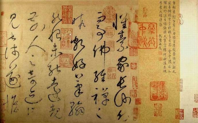 唐书法家僧怀素草书。中华第一草书,系中华十大传世名帖之一。纸本,纵28.3厘米,横775厘米,共126行,698字。书於唐大历十二年(公元777年)。藏台北故宫博物院。首六行早损,为宋苏舜钦补书。帖前有明李东阳篆书引首“藏真自序”四字,后有南唐升元四年(公元940年)邵周、王囗囗重装题记。《自叙帖》是怀素流传下来篇幅最长的作品,也是他晚年草书的代表作。