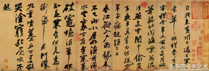 《黄州寒食诗帖》释文:自我来黄州,已过三寒食。年年欲惜春,春去不容惜。今年又苦雨,两月秋萧瑟。卧闻海棠花,泥污燕支雪。暗中偷负去,夜半真有力,何殊病少年,病起头已白。春江欲入户,雨势来不已。小屋如渔舟,蒙蒙水云里。空庖煮寒菜,破灶烧湿苇。那知是寒食,但见乌衔纸。君门深九重,坟墓在万里。也拟哭途穷,死灰吹不起。