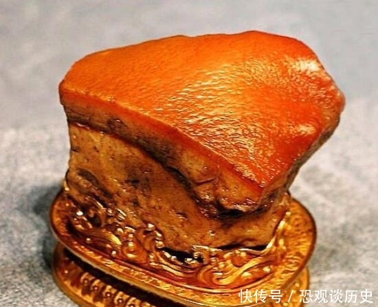 此肉形石出自内蒙阿拉善左旗,清康熙时供入内府。这块清代的肉形石,是一块天然的石头,色峰纹理全是天然形成的,取自一块黄玉,经人的鬼斧神工,竟然雕成了一块玉东坡肉。看上去完全是一块栩栩如生的五花肉块。“肉”的肥瘦层次分明、肌理清晰、毛孔宛然。无论是色彩还是纹理,都可以乱真。人们似乎都能闻到红烧肉的香味。真正的人间极品,价值连城。其创意构思之巧妙,雕刻技法之精湛,令人叹为观止。>