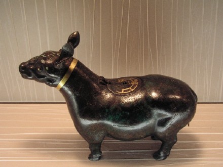 随着青铜铸造技术的逐渐普及,青铜器到周代已被广泛应用在厨具酒具到以后的乐器及装饰品。台北故宫博物院的藏品有许多1949年以前出土的精品,按照制造年代顺序,向人们展示了中国青铜器的艺术发展史。这里的镇馆藏品有西周的“毛公鼎”、“散氏盘”等诸多传世之宝,然而给人印象最深的是一只铜狗。这只铜狗造型可爱,一对金色的眼睛和脖子上的金项圈与青绿色的的身体形成了鲜明的对比。咋一看还以为这只是一件精致的饰品,但仔细看才发现狗背上各有一个圆孔,而且狗的下颚也有一个小洞。原来这是一件酒壶,主人可以从狗背往壶里灌酒,饮酒时可以将酒从狗的下颚倒入杯中,或者可以直接持壶畅饮。这一件铜器是汉代的作品。青铜器后期很多作品多为酒器或装饰品,而这件作品成功的将两者合二为一。