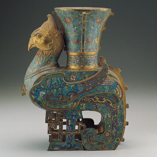 铜胎,仿铜器天鸡尊形制,凤首,喇叭口,背和尾部的T形稜脊镀金,馀均蓝地满布各色羽毛、缠枝花、凤鸟及拐子龙等纹饰,以内卷的尾羽和镂制成拐子龙形状的双足为座,器物沉重,釉色鲜明豔丽,是上好的陈设器。属十八世纪中後期的文物。天鸡作立身翘首状,背负螭耳尊,双翅扬起贴于尊身,足登镂空双轮,长尾下垂内卷,尾羽内侧立一铜镀金小天鸡。螭耳尊椭圆体,撇口,螭耳镀金。