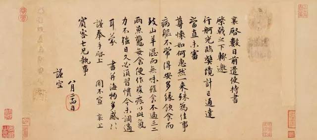 释文:襄启:数日前遣使持书棨戟之下,辄邀行舸光临弊境,计已通 达当直,未审尊怀如何?惠然一来,殊为佳事。病躯不常得安,多 缘饮食而致。山羊涩而无味,虽食不过三二两,鱼鳖每食便作腹疾, 以此气力不强,日久必须习惯,今未凋适耳。蒙书并海物,多感多 感! 谨奉手启上闻。不宣。襄上,宾客七兄执事。八月二十四日。 谨空。