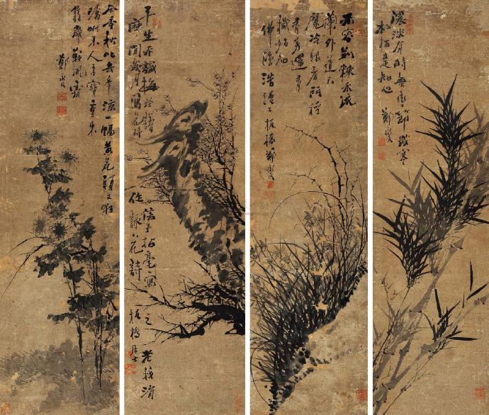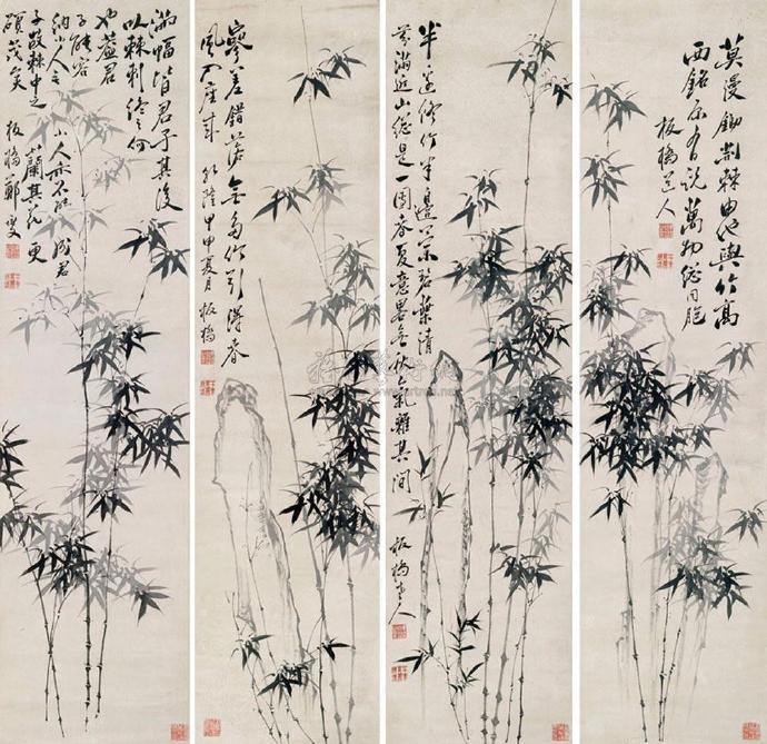 题画诗在他笔下,除了在内容上有思想性,抒情性以外,在形式上还更具有艺术性、趣味性。题画诗能充分体现“书画同源” “用笔同法”的艺术趣味,而传统画家的题款跋文,大多题于画的空白处,与画面起平衡作用,但“扬州八怪”的题款已脱传统国画以及“文人画”题款、题诗的窠臼,特别是郑板桥将书法与画糅合在一起,还成了共同表现形象的特殊手法,彼此关系不分割。如《兰石图》,郑板桥别具匠心地将诗句用书法的形式,真草隶篆融为一体,大大小小,东倒西歪,犹如“乱石铺街”地题于石壁上,代替了画石所需的皴法,产生了节奏美、韵律美,又恰到好外地表现了石头的立体感、肌理美,比单纯用皴法表现立体感更具有意趣。这倒成了不可或缺的表现方法,既深刻揭示兰花特征,寓意高尚人品的意境美,又有书法艺术替代皴法的艺术美。让人在观画时既享受到画境、诗境的意境美,又能享受到书法艺术的形式美,沉浸在诗情画意中。另在许多兰竹石的画幅上,他题诗的形式变化多端,不守成规,不拘一格,自然成趣,达到书佳、行款得体,画亦随之增色。所谓行款得体,即是视画面的实际,进行构思,讲究构图的形式美,因而他将题画诗或长题于侧,或短题于上下,或纵题、或横题、或斜题、或贯穿于兰竹之间、藤叶之间,断断续续地题,观其形态,参差错落,疏密有致。是书也是题,是画也是诗,是诗也是画,欣赏每幅画中题画诗,既是绝妙的书法再现,也是将书画相映成趣的综合艺术,书题与画面有机地交融在一起,构成了统一的诗情画意,给人以综合的完美的艺术享受。因而,世人无不赞叹他们是诗书画印融为一体的最佳创作者。