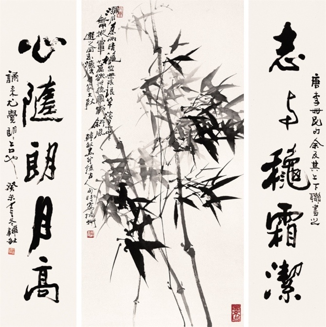 两枝修竹出重霄,几叶新篁倒挂梢。