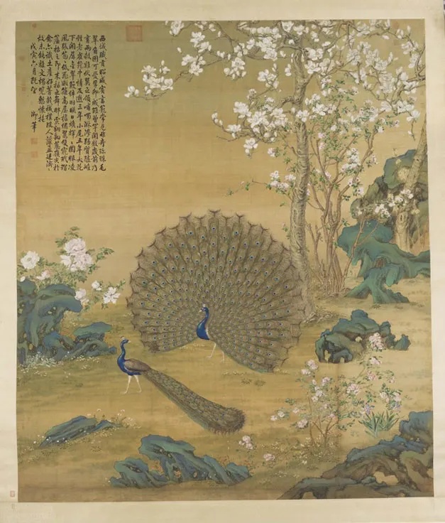 畫面:玉蘭、海棠花盛開,兩只禽鳥棲于玉蘭枝頭,一上一下,一俯一仰,相互呼應,禽鳥情態形象逼真,海棠、玉蘭造型准確,反映出畫家郎世甯寫生功力的精湛。然景物莫不布置細巧,且賓主呼應得宜,可謂兼融中西畫法之難得傑作。