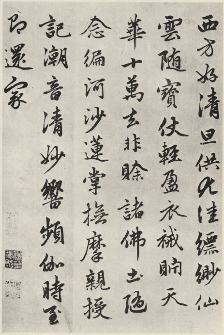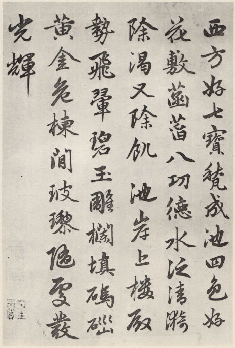 西方好。琼树耸高空。弥覆七重珠宝网。庄严百亿妙华宫。宫里众天童。
