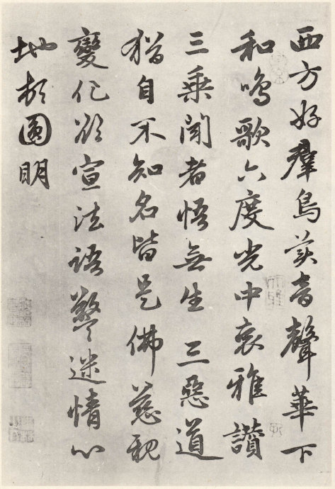 西方好。群鸟发音声。华下和鸣歌六度。光中哀雅赞三乘。闻者悟无生。