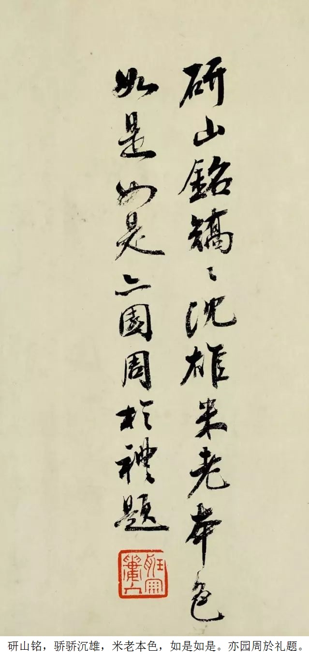 研山铭,骄骄沉雄,米老本色,如是如是。亦园周於礼题。