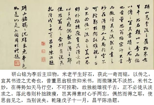 研山铭为李后主旧物,米老平生好石,获此一奇而铭,以传之。宜其书迹之尤奇也,昔董思翁极宗仰米书,而微嫌其不淡然。米书之妙,在得势如天马行空,不可控勒,故独能雄视千古,正不必徒从淡求之。落此卷则朴拙踈瘦,岂其得意时心手两忘,偶然而得之耶,使思翁见之,当别说矣。乾隆戊子十一月,昌平陈浩题。