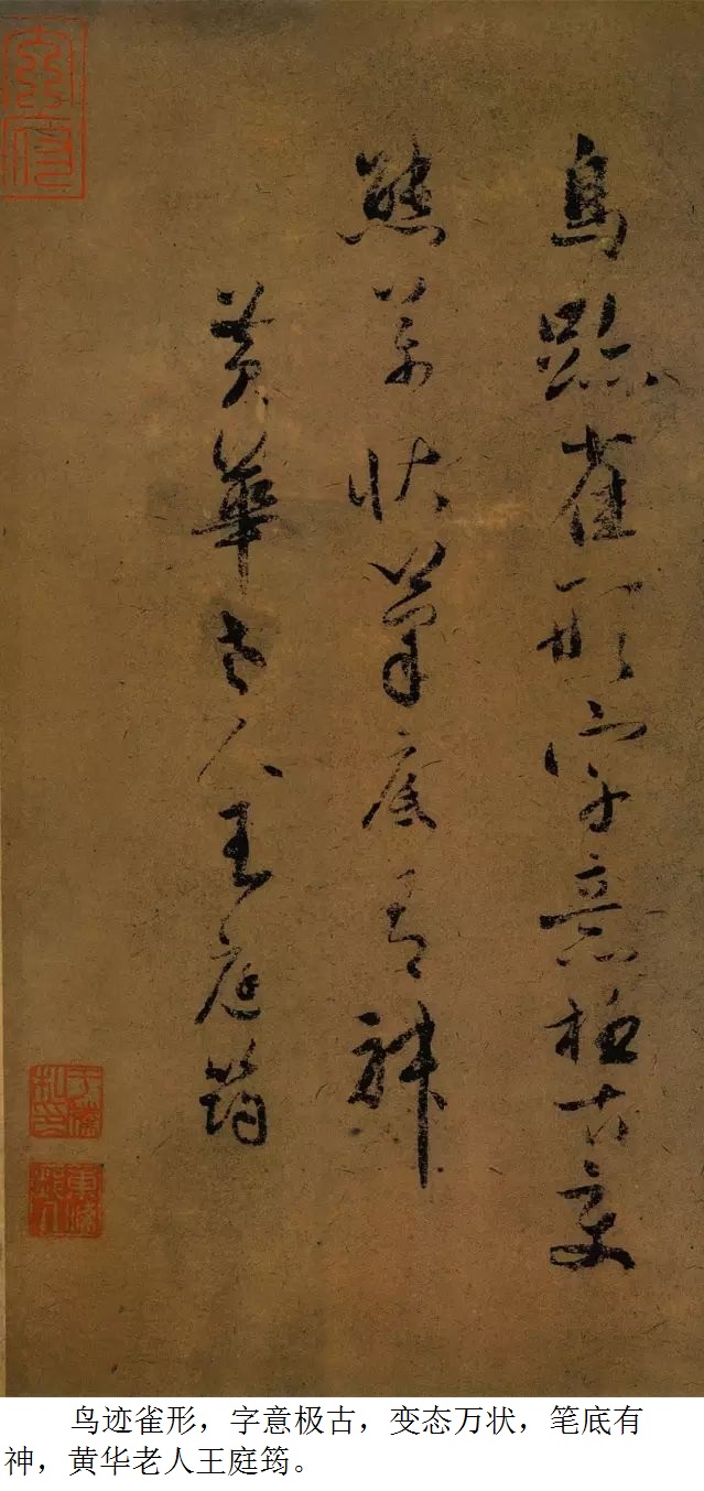 鸟迹雀形,字意极古,变态万状,笔底有神,黄华老人王庭筠。