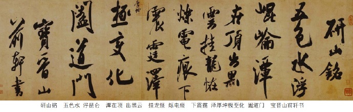 《研山铭》是米芾书法精品中的代表作。此帖沉顿雄快,跌宕多姿,结字自由放达,不受前人法则的制约,抒发天趣,为米芾大字作品中罕见珍品。
