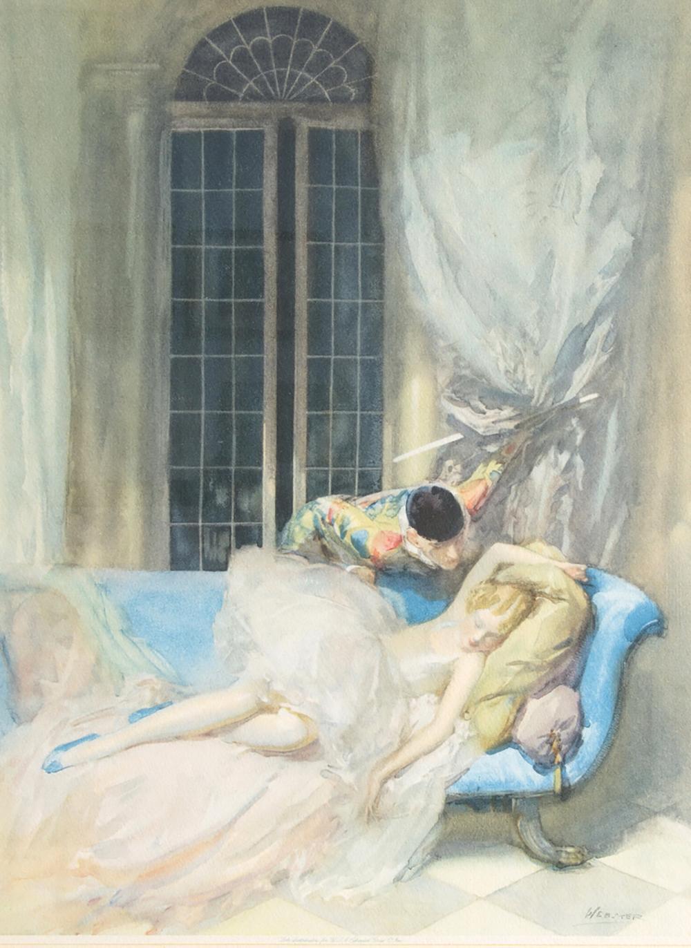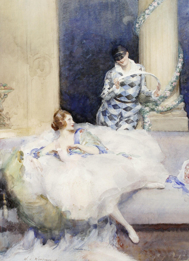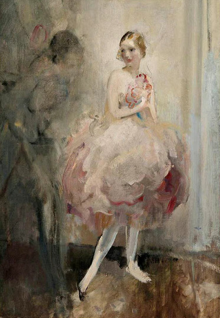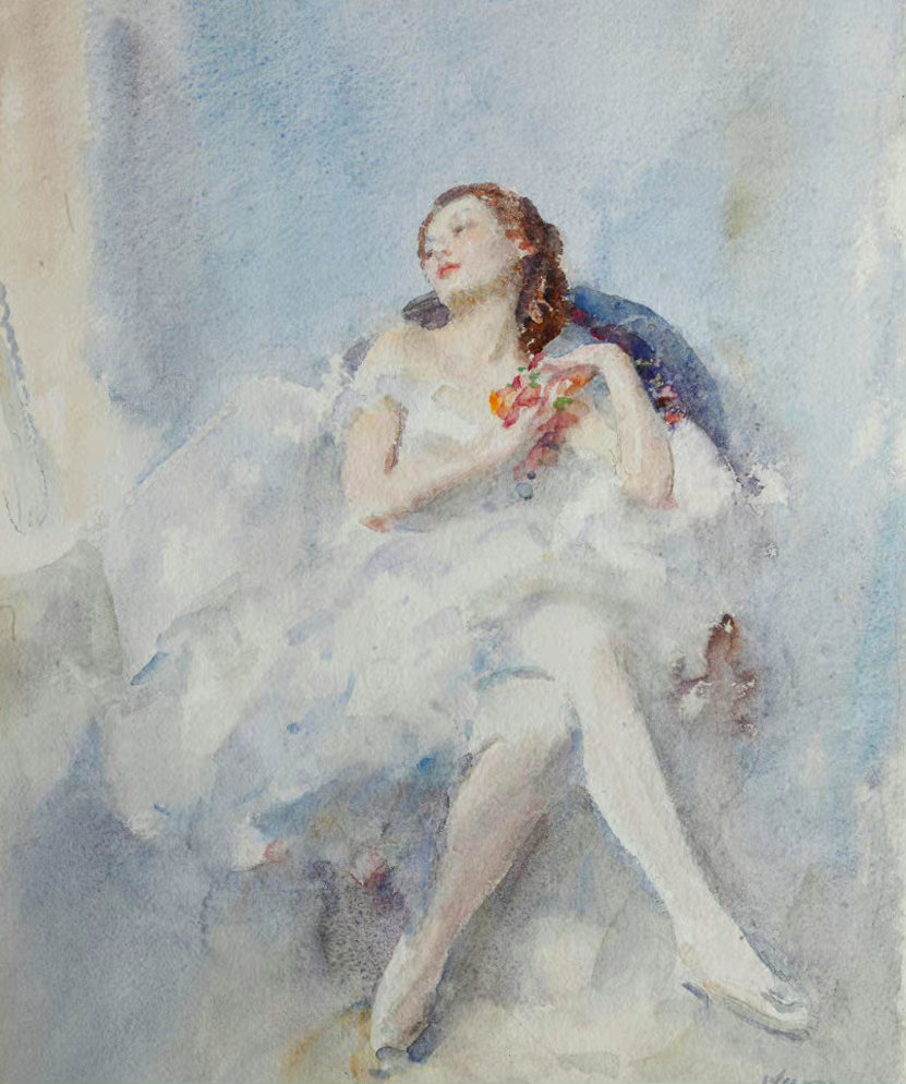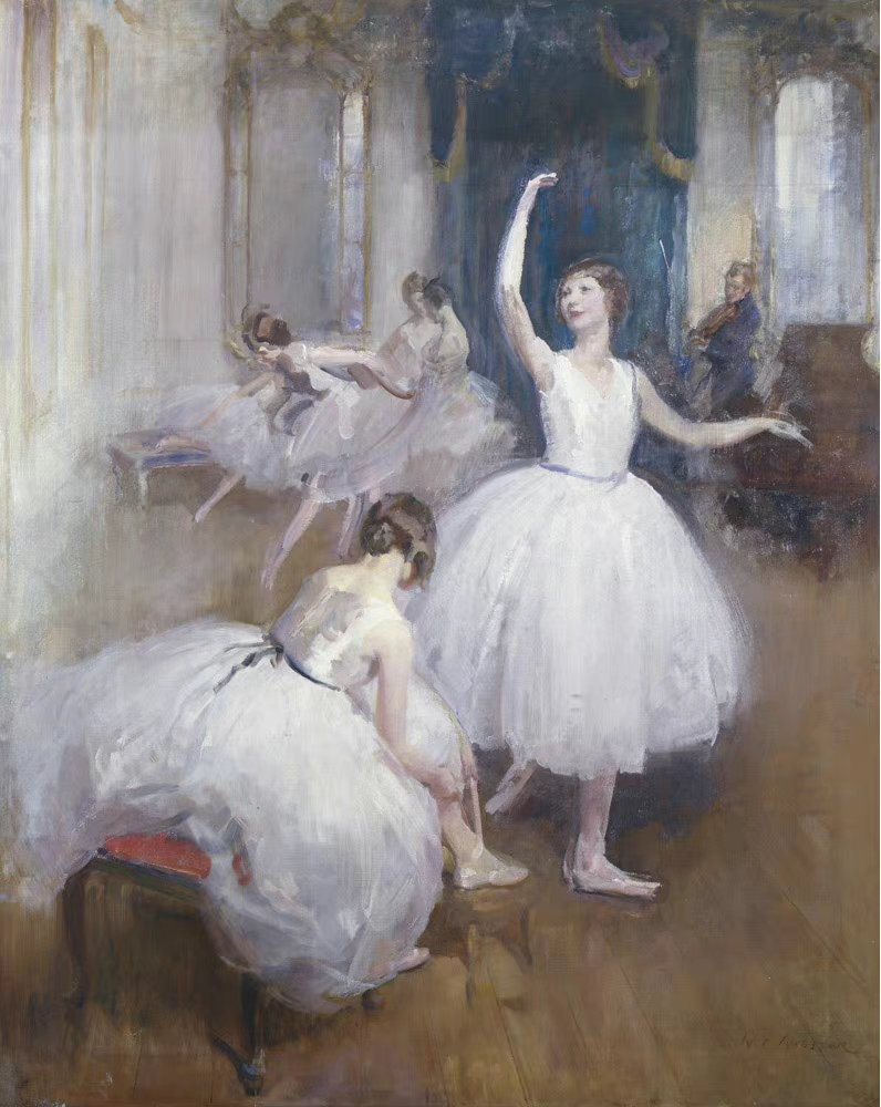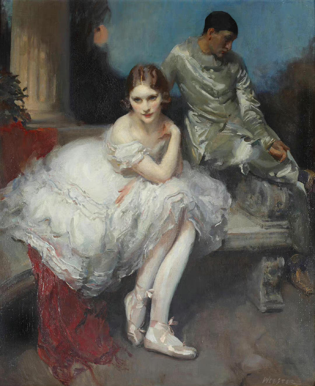 19世纪英国艺术家沃尔特·欧内斯特·韦伯斯特(Walter Ernest Webster ,1877-1959)笔下的芭蕾舞女。韦伯斯特曾在英国皇家艺术学院学习,以年轻女性的肖像而著称,他绘画的主题之一便是芭蕾舞女,笔触轻快流畅,色彩柔美,神态刻画极为传神,并带有一丝洛可可式的妩媚与旖旎。