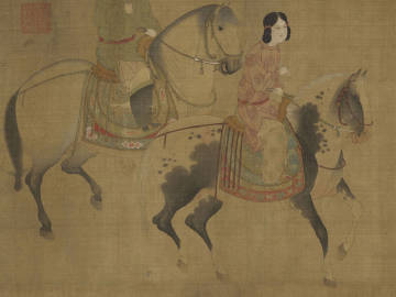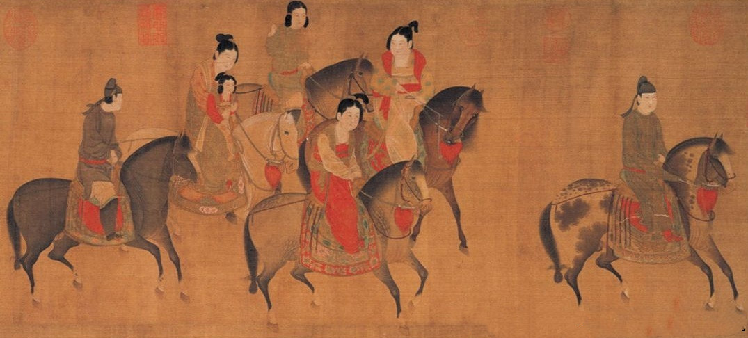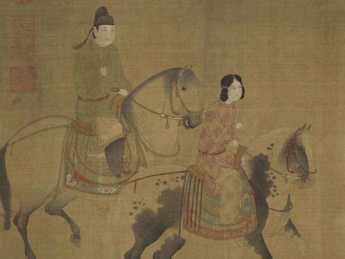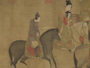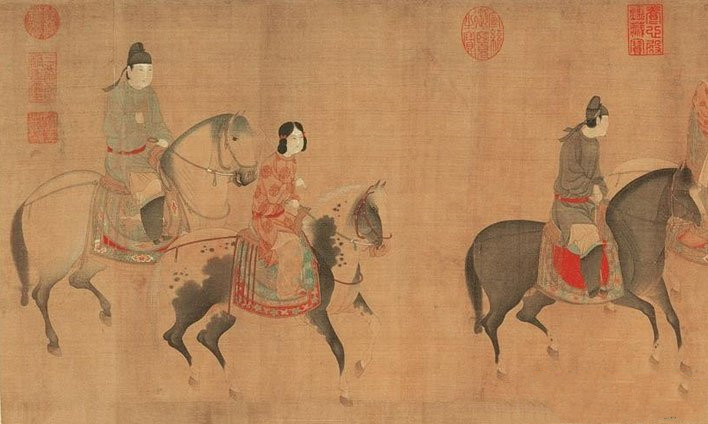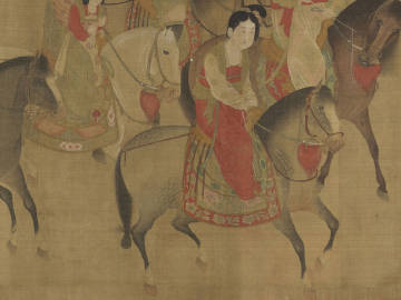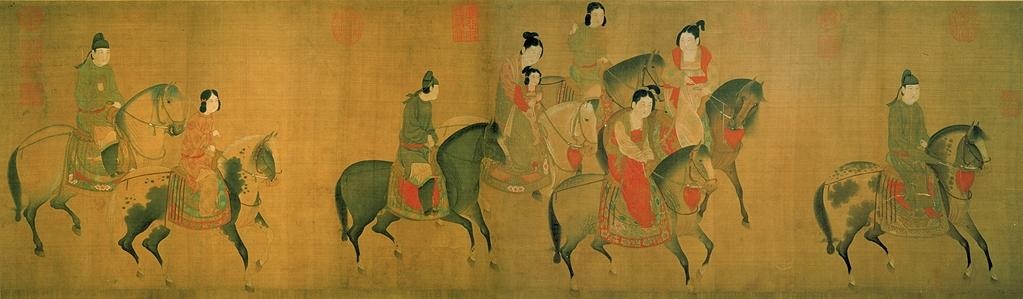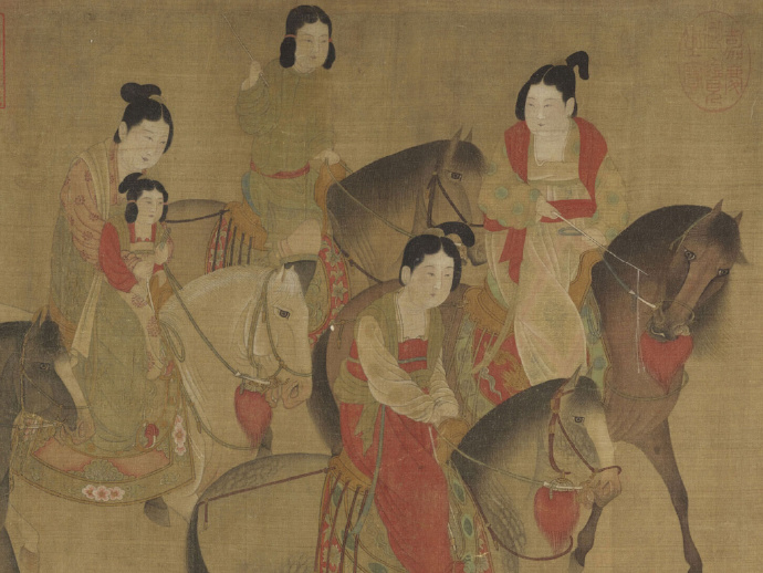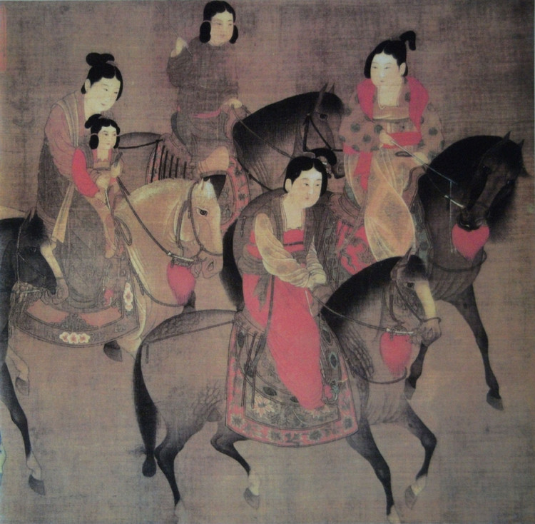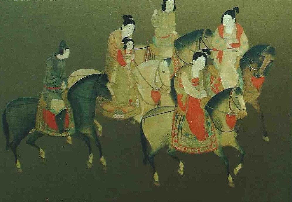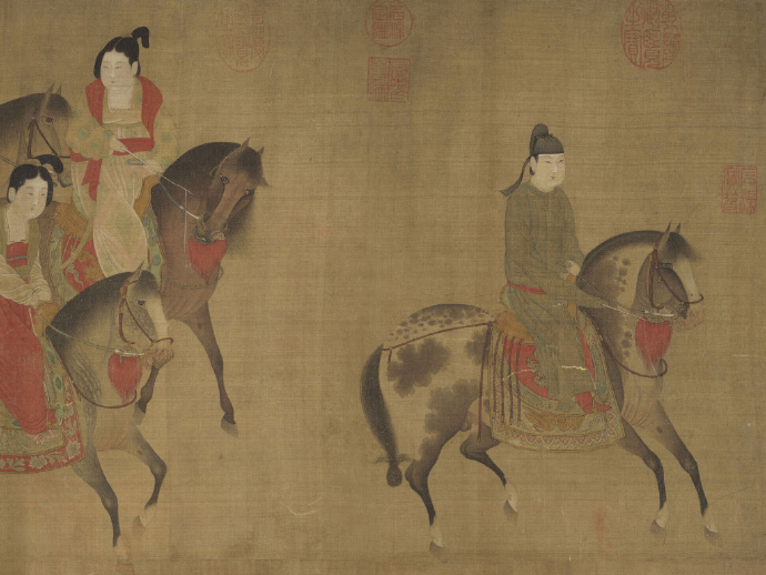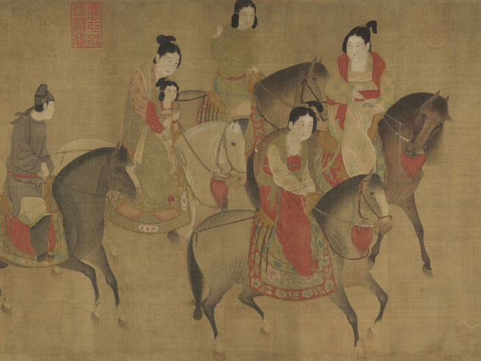 《丽人行》描绘了秦、韩、虢三夫人春游长安水畔的情景。该画设色明艳,清雅丰美,人物与马匹均形神俱备,大有晚唐遗风。画面上,领前的是一位身材高大的太监,马速似乎太快,他正勒转马头使其暂停。一太监和两名宫女在后,另一扛衣太监骑青鬃马紧随三位夫人前行,以便随时救护。左前白马上面,是雍容华贵的韩国夫人,体态苗条,全神贯注于怀中女儿。虢国夫人则轻盈地单勒马缰,使马四蹄舒缓,马首右转。她身着粉色长裙,鲜红背心,流目女童。外侧绿衣宫女护卫的,是朱丹峨眉的秦国夫人,骑的是一匹花马,她艳红低胸长袖,紫蓝背心,双手控缰,虽慎骑谨坐,仍不失其娇美。李公麟的画,较完美地表现了杜甫的诗意。