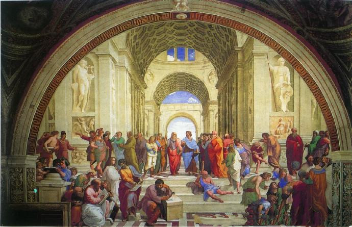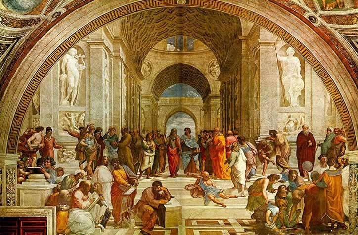 这幅巨型壁画把古希腊以来的50多个著名的哲学家和思想家聚于一堂,包括柏拉图、亚里士多德、苏格拉底、毕达哥拉斯等,以此歌颂人类对智慧和真理的追求,赞美人类的创造力。