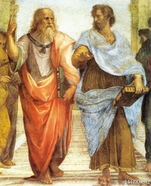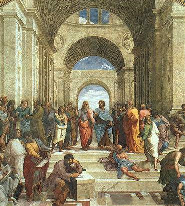 画面中央,两位伟大的哲学家柏拉图和亚里士多德雕像般地站立在最前面,一个以指头指着上天,另一个则伸出右指指着他前面的世界,以此表示他们不同的哲学观点。以他们两人为中心,两面跟着的有哲学家苏格拉底、数学家毕达哥拉斯、天文学家托勒密、物理学家阿基米德等50多人。人物虽多,但多而不乱。无论是站、是蹲,是依,是靠,是沉思,是争辩,所有的人都面向柏拉图和亚里士多德,在质疑问难和探求真理的主题下统一起来。整个壁画洋溢着浓厚的学术研究和自由辩论的空气,所有的人都是那样毫无拘束地按照自已的意志和个性在进行活动,反映了人文主义者对科学文化繁荣的向往。