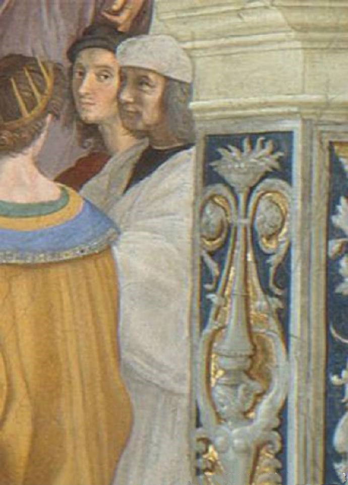 托勒密的对面是大建筑家布拉曼特。画面的最右端是拉斐尔的好友著名画家索多玛。索多玛旁边头戴无檐帽,注视着观众的那个人就是;拉斐尔本尊。