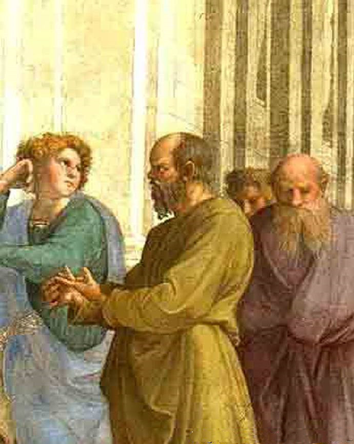 在西方毕达哥拉斯被认为是 “勾股定理”的发现者。事实上毕达哥拉斯也是第一个自称哲学家的人。他将希腊文Philo(爱)和sophos(智慧)组合起来创造了(PHilosophos哲学)一词,意为爱智慧。毕达哥拉斯后面那个伸着脖子头缠白巾的学者是回教学者阿维洛依,背后不远头戴桂冠,胸靠柱基站立的人是语法大师伊壁鸠鲁。在毕达哥拉斯前面站立的用手指着书中句子的学者是修辞家圣诺克里特斯。身旁身穿白色斗篷金发的年轻人是教皇的侄子乌尔宾诺公爵弗郎西斯科·德拉·罗斐尔。