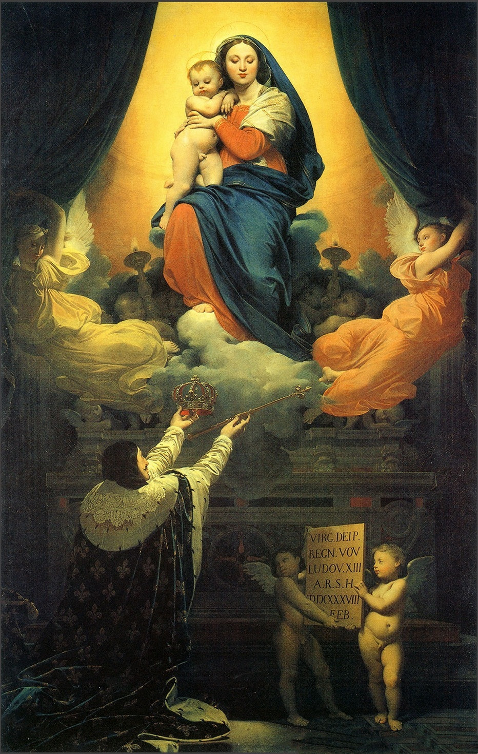 拉斐尔以往的圣母像,总是太过完美无缺,具有母亲与情人的精神气质。《西斯廷圣母》有所不同,这里的圣母俨然成了人类的救世主。她沉思的目光中,怀着对人世巨大的悲悯与慈爱,她已决心牺牲自己的孩子,来拯救苦难深重的世界。13世纪时,意大利的伟大诗人但丁曾这样赞颂这位伟大的母亲:她走着,一边在倾听颂扬,身上放射着福祉的温和之光,仿佛天上的精灵,化身出现于尘壤。