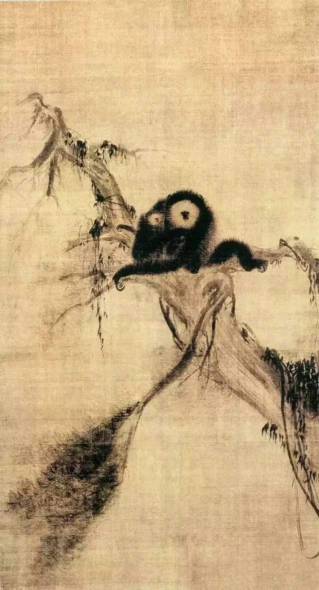 一棵枯松斜插天际,猿猴的重色稳定了画面的重心。作者用浓墨画猿猴的躯干、脚爪,然后用笔反复皴擦,使毛皮的质感十分强烈。猿猴面部留白,眉眼用焦墨随意点出。松树枝干的描绘狂乱泼辣,是作者常用的“蔗渣草结”式的笔法。法常(?—1281)是南宋西湖长庆寺的和尚,早年是儒生,中年出家。与当时来中国的日本僧人关系不错,许多画作流传到日本,对日本绘画产生很大影响。传世作品有《猿图》《渔村夕照图》,另有《龙、虎》对幅等。