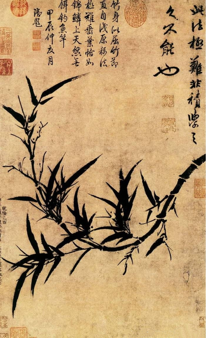 竹枝一竿,自上倾下,又翻转而上,用笔苍劲,竹叶用浓墨画出,主干用墨稍淡,将人的注意力全部集中在长势劲猛的竹叶上,表现出自在而顽强的精神境界。