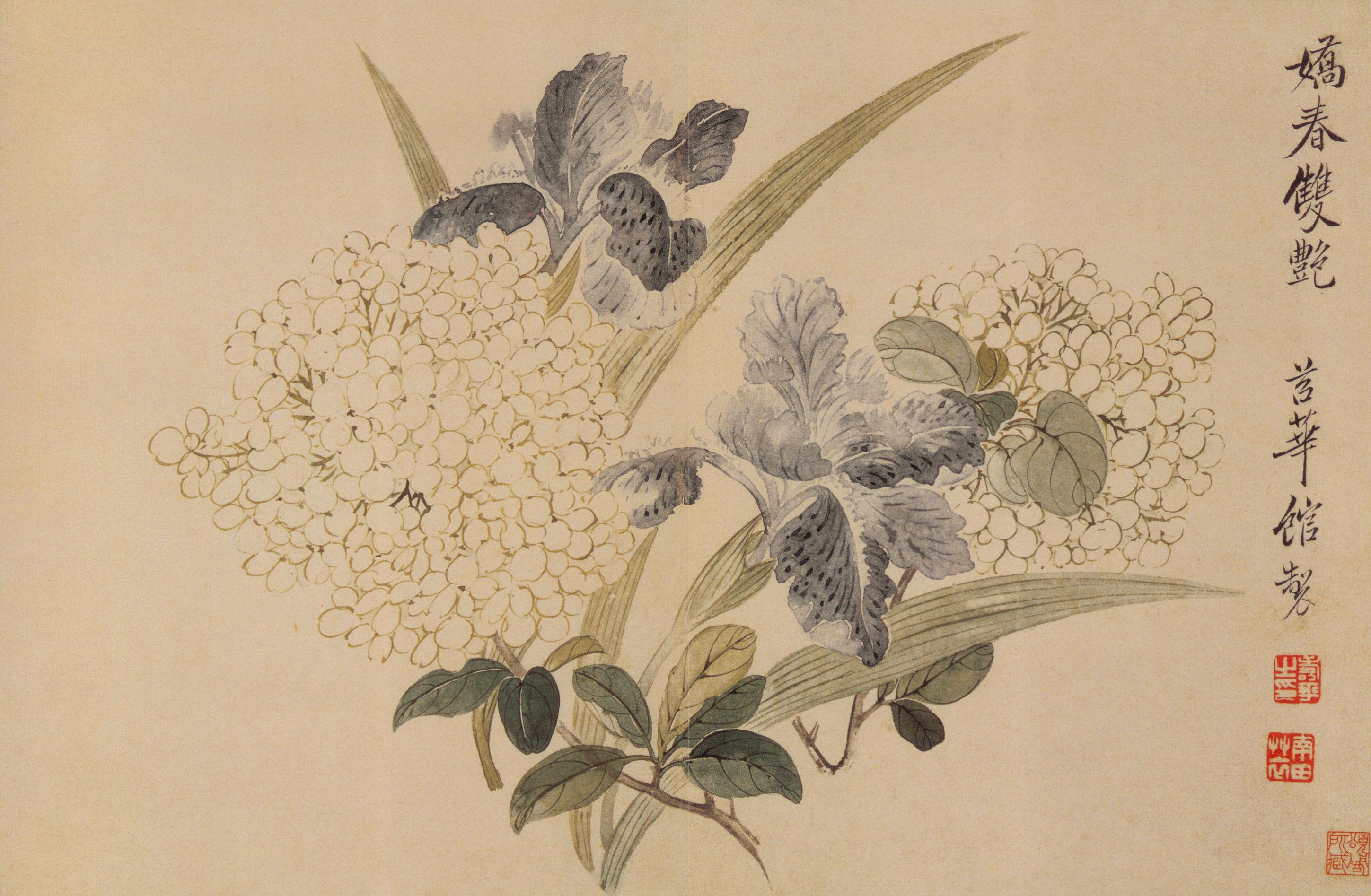 《山水花卉神品》册页作于康熙二十三年(1684年),恽寿平时年五十一岁。册页共十开,花卉其七,山水其三,作者自题为拟古十种。七开花鸟,除了一开水墨竹石仿赵孟頫笔意,其余都是没骨设色,正是恽氏当行本色。没骨画法即不用勾勒,多以晕染造型写意。此册中《牡丹》、《桃花》两开最具典型。牡丹作盛放之态,花辦重重展开,层层叠叠,俱交代清晰,却不见勾勒的痕迹,只以色彩晕染,造型赋色,一以出之。桃花花辦娇小,花形简单,便直接点染而成。这样的描绘,最能表现花卉的娇嫩生动,没有僵滞迟涩之虞,色深而重的,显得雍容艳冶,色轻而淡的,显得文秀婉约。恽氏用色,堪称一绝,重而不俗,艳而不妖,淡则不觉寡淡,轻则不显轻薄,配搭协调,恰到好处。其山水分別拟赵伯驹、曹知白、方从义。恽寿平的山水用笔清灵飘逸,气息俊秀潇洒,与当时主盟画坛老成持重的四王风尚相比,別有一段裊娜风流的韵味。恽寿平善诗文和书法,与其绘画相配,更能相互生发。恽氏诗格超逸,被誉为“毗陵六逸之冠”。书法主要学褚遂良,得其神髓,遒逸可爱,画笔生动,被称为“恽体”。恽寿平的诗与其书、画有同样的意趣与韵味,他为《牡丹》一开所题的诗,正可作为这件册页的旁注:吹罢琼箫咽凤尘,粉痕暗减镜中春。低垂翠袖红妆侧,舞倦龙绡一美人。