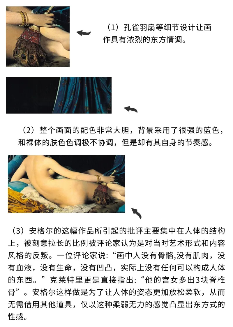 画面描绘了一个古典的、东方式的宫女斜卧在床榻上,松软光滑的绸缎环绕周围,其中最吸引目光的莫过于人物夸张的比例,背部、手臂和腿部看起来都要比实际人体更加修长,这种塑造人体形态的方式显示了画家自弗兰西斯科·帕尔米贾尼诺的《长颈圣母》中所受到的启发。安格尔将这种变形更加深化,光滑圆润的曲线贯穿整个画面,丝毫没有因现实的阻挡而有所停顿。