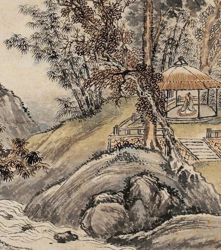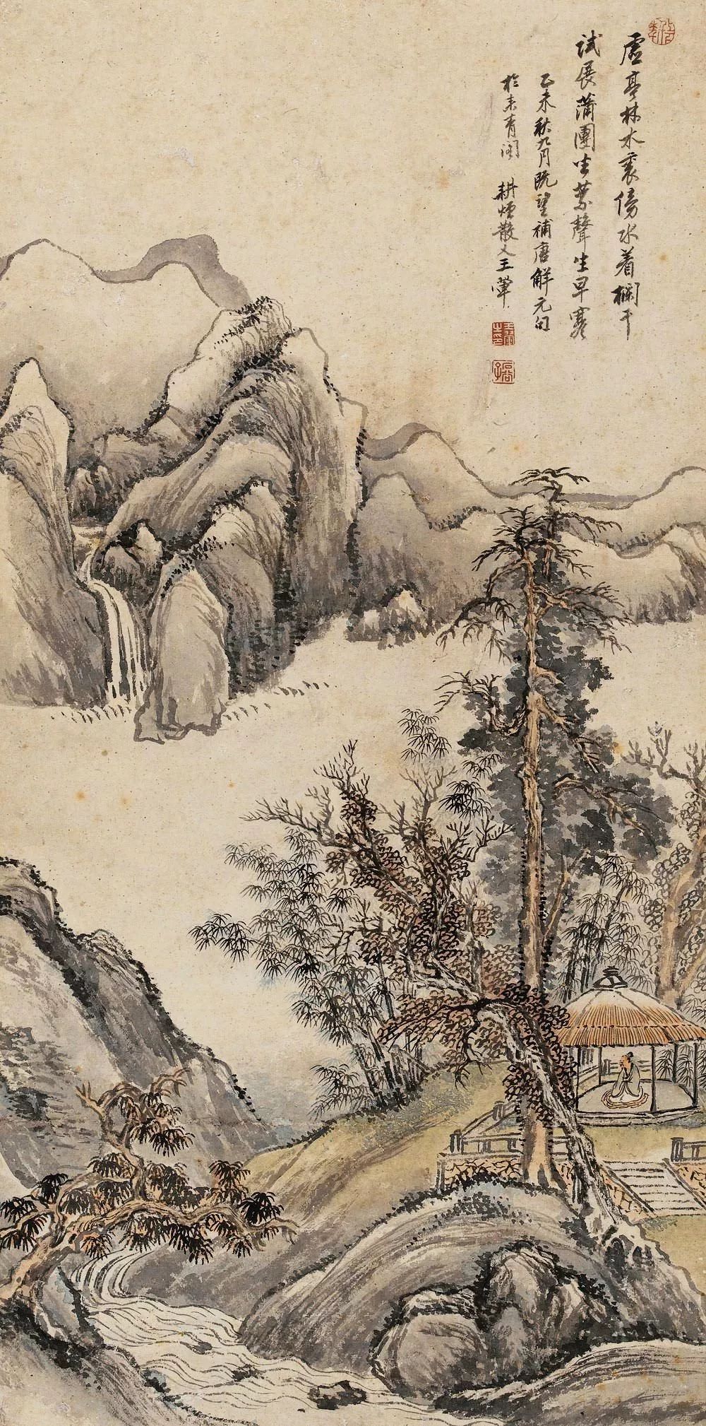 王翚在清初四王中摹古最厉害,他能做到以假乱真的地步。这样的画功宋代有米芾可以做到,近现代张大千也有这个本事,通过这两位名家做对照,就可以感受到王翚的才情。诗意图是古人很喜欢画的一种题材,唐代诗人王维就被赞誉为“诗中有画,画中有诗”。画诗意图不仅仅是图解诗句,还要画出诗中含蓄的情感。唐寅曾经画过一幅《虚亭听竹图》,画中题有“试展团蒲坐,叶声生早寒”。唐寅要表达是孤寂与忧伤,流露出他性格中柔弱的一面。王翚把唐寅奉为“偶像”当然不能像唐寅本人那样坦荡地剖析心意,画寂寥空虚的山水。王翚在创作中以禅意入画,美化了唐寅诗中的氛围,整幅作品看起来有一种空灵之美。