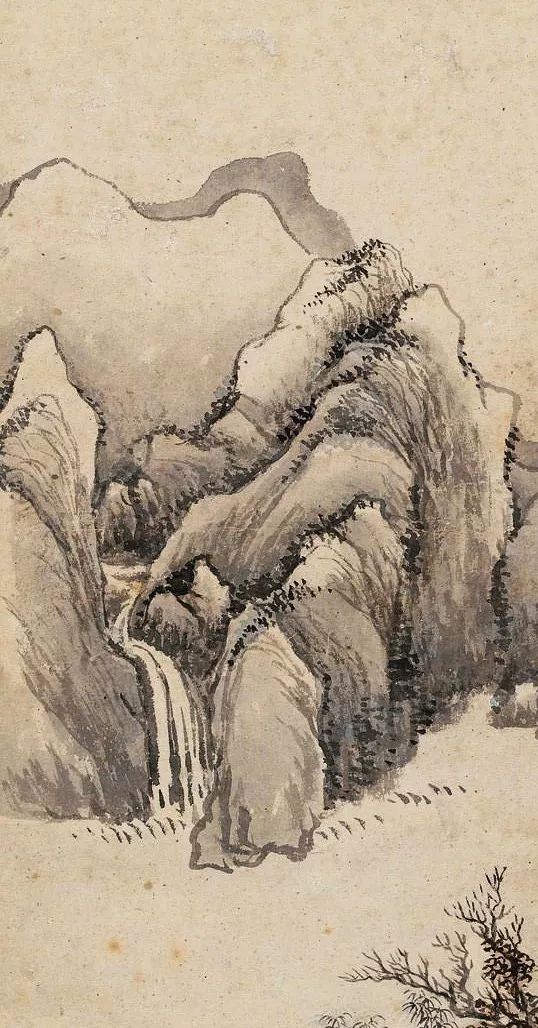 王翚画这幅《唐寅诗意图》在笔法构图上像唐寅的风格靠拢。整幅作品看起来很清爽,溪山幽谷,大树草庐,瀑布仿佛一块薄纱涓涓潺潺缓缓淌过。这样秀美的风光一看就是江南美景。王翚擅长画气象万千、气派工秀的山水,在这幅作品里也藏不住这一特点。画面下方有两组大树,溪水左边的松树王翚想要画的古朴天然一些,却看起来很是拘谨。就好比一个人唱歌时喜欢用美声,但偶尔要唱民歌小调虽然音准没有问题,但味道始终不对。能力再强大的画家也藏不住他的习惯,于是有人说过用言语骗人容易,用作品骗人很难。只有投入真挚的情感才能画出好的作品,但凡有一点虚假,整幅作品中就露出败笔。