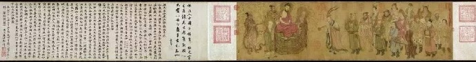 此圖畫中國周邊少數民族酋長、番王朝拜佛祖的形象。佛祖高坐蓮台,諸番王作禮拜、貢獻之狀,服飾皆異域裝束。畫面氣勢宏大,人物安排疏密有致,表情各異,生動自然,是宋代人物畫的一幅傑作。