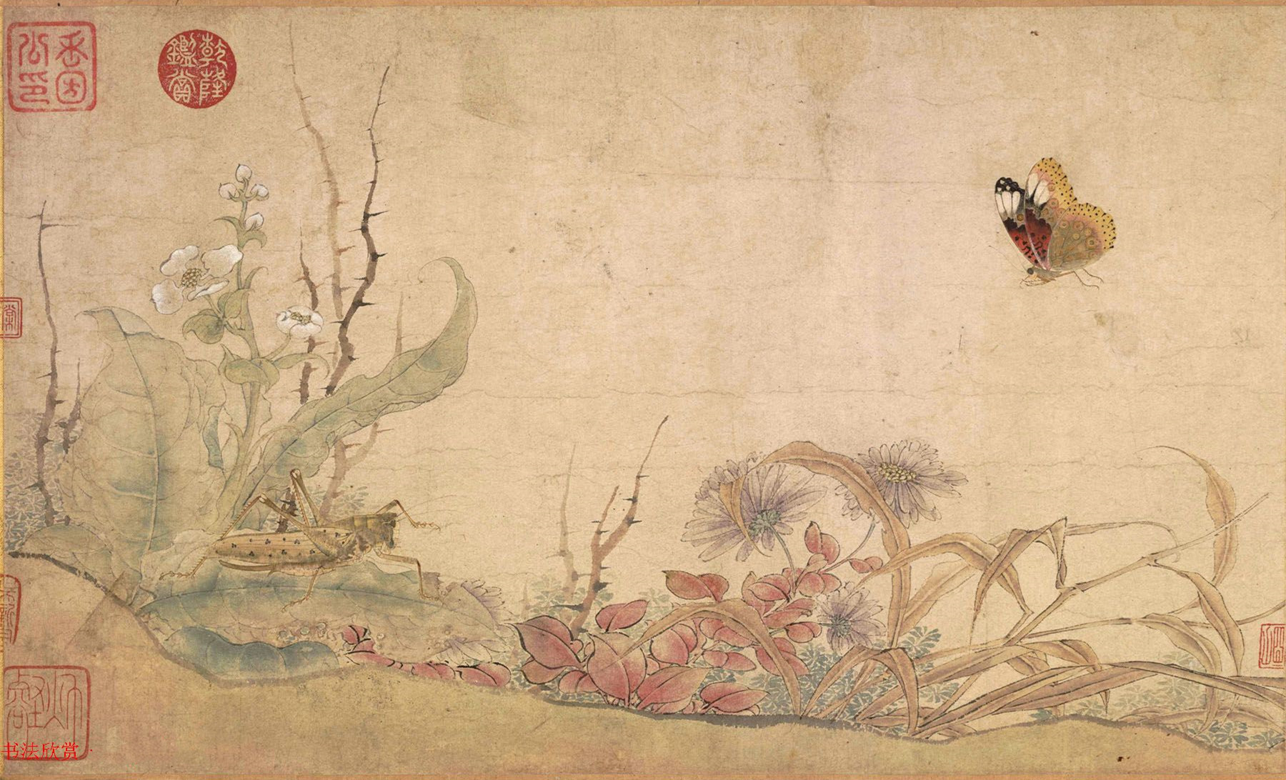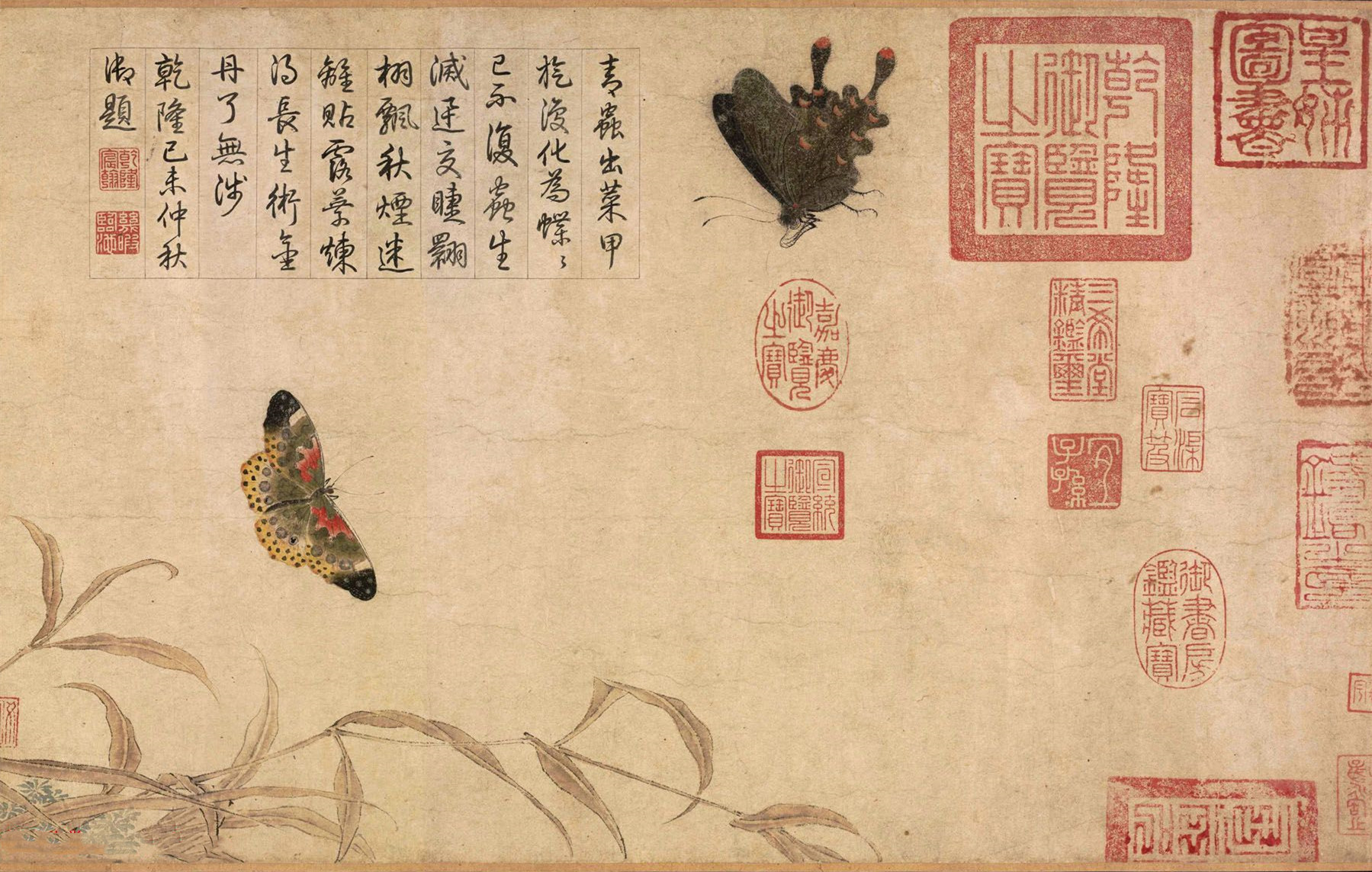 《写生蛱蝶图》画面上有乾隆己未仲秋御题:“青虫出菜甲,起复化为蝶;蝶已不复虫,生灭迅交睫。翮栩飘秋烟,迷离贴露叶;炼得长生术,金丹了无涉”。