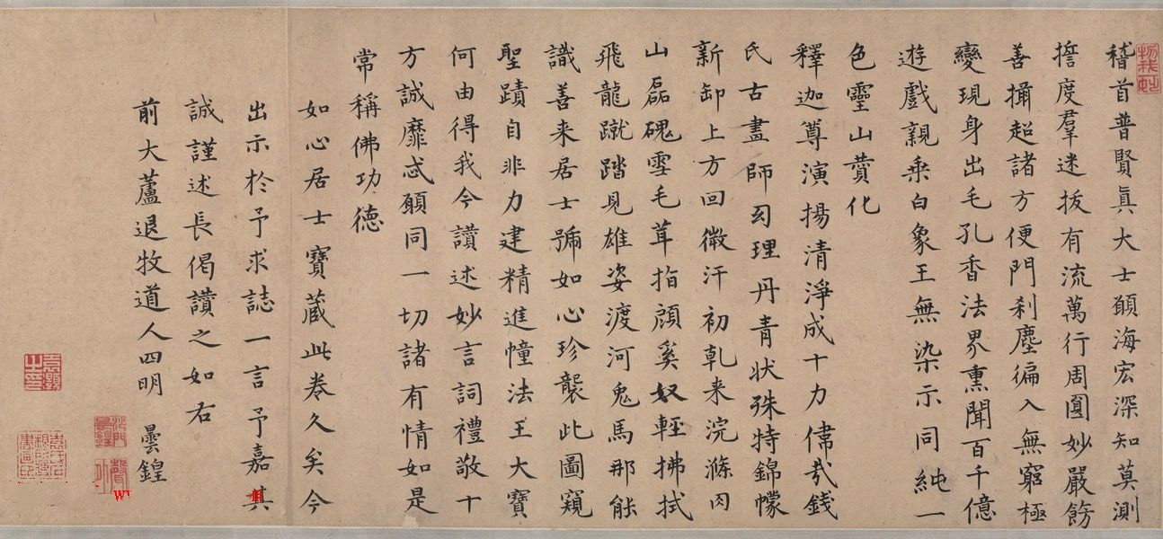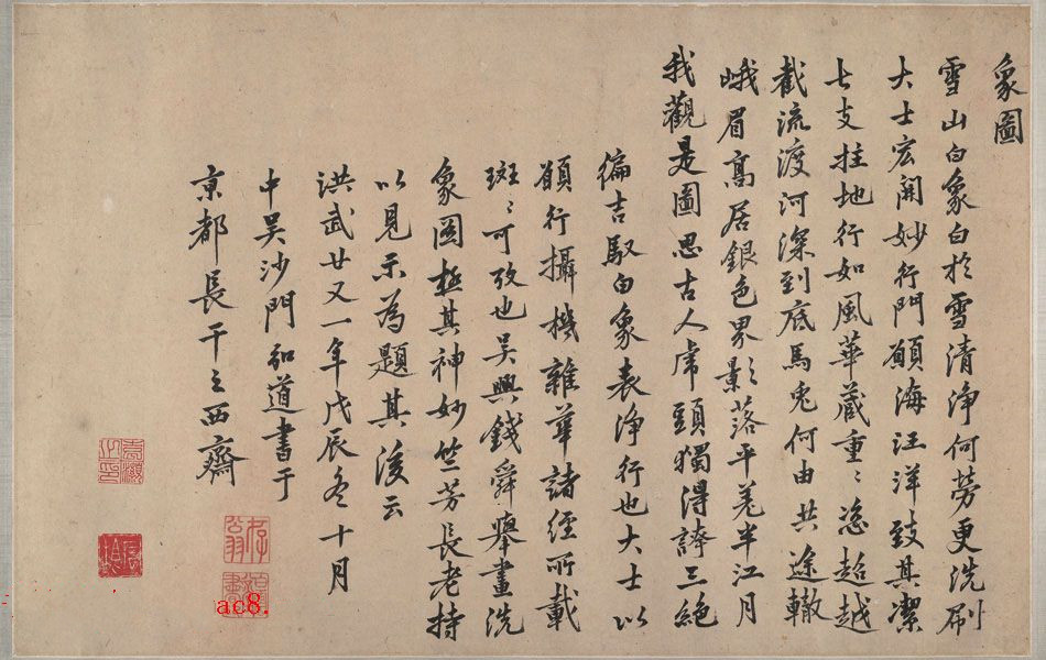 钱选书画精品欣赏《宋钱舜举洗象图真迹》,美国大都会博物馆藏。钱选(1239-1301),字舜举,号玉潭,吴兴人。宋景定三年乡贡进士。工诗,善书画。继承苏轼等人的文人画理论,提倡士气说,倡导戾家画。他提倡绘画中的“士气”,在画上题写诗文或跋语,萌芽了诗、书、画紧密结合的文人画的鲜明特色。钱选与赵孟頫同乡并同享盛名。与赵孟頫、王子中、牟应龙、肖子中、陈天逸、陈仲信、姚式并称“吴兴八俊”。