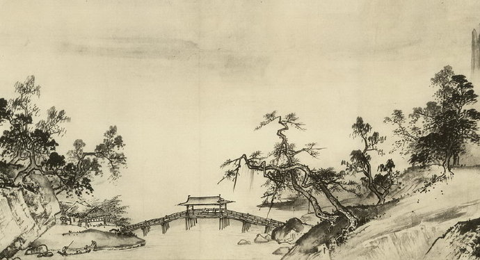 夏圭(活动于1180-1230前后),字禹玉,钱塘(今浙江杭州)人。与李唐(约1049-1130后)、刘松年(活动于1174-1194)、马远(活动于1190-1224)合称为南宋四大家。善画山水、人物,长于运用秃笔,画楼阁亭台不用界尺,只信手为之,笔意精密,奇绝突兀,气韵颇高。宋宁宗(1195-1224)时为画院待诏,与马远同时代,都师承李唐,风格相近:构图简括深远,笔墨峻峭爽利,擅用“斧劈皴”,后人并称“马夏”。但如细察,两者还是有明显的区别:相对而言,马远重笔,转折顿挫,凝重峻利,而夏圭善墨,善用秃笔带水作大斧劈皴,人称“拖泥带水皴”,“淋漓苍劲,墨气袭人”;构图上,马远刻意将近景置观者目前,所画人物五官清晰,姿态生动,楼阁则以“界画”法刻画精细,而夏圭则将景物远置观者身外,画人物仅圈脸勾衣、点簇而成,楼阁随手勾画,笔简而形具。这影响延及元代:王蒙画中近景人物其衣冠、五官、举止皆精细生动;倪瓒画中几乎无人,而黄公望与吴镇画中人物的简笔则显然取法夏圭,画面之空寂,也分明承袭李唐以至马远、夏圭的简略遗风。