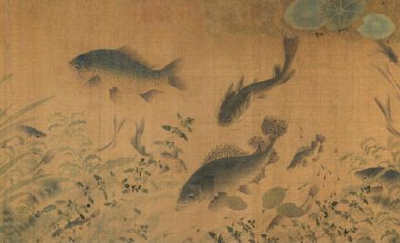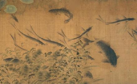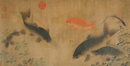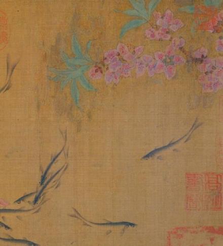 此图开始先画盛开的杏花,伸向水面,向后展开,落花引来群鱼争食,或聚或散,或潜游,或上浮,或回泳,翻藻戏蒲,以示水中的畅泳自然之态。其画法全用渲染,间或用没骨法,不见钩勒,活泼生动。这种表现方法和诗情画意,独创一格,多为后人所仿效。