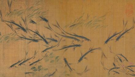 画中鱼栩栩如生,先画盛开杏花伸向水面,向后展开,落花引来群鱼争食,或聚散,潜游,上浮,回泳,翻藻戏蒲,以示水中畅泳自然之态。其画法全用渲染,间或用没骨法,无钩勒,活泼生动。此表现方法诗情画意,独创一格多为后人所仿效。