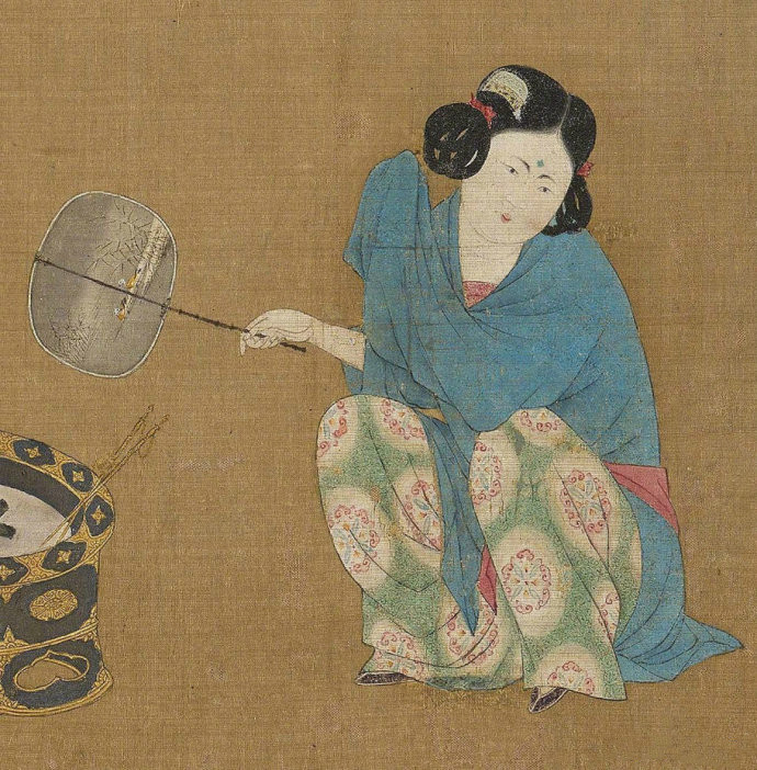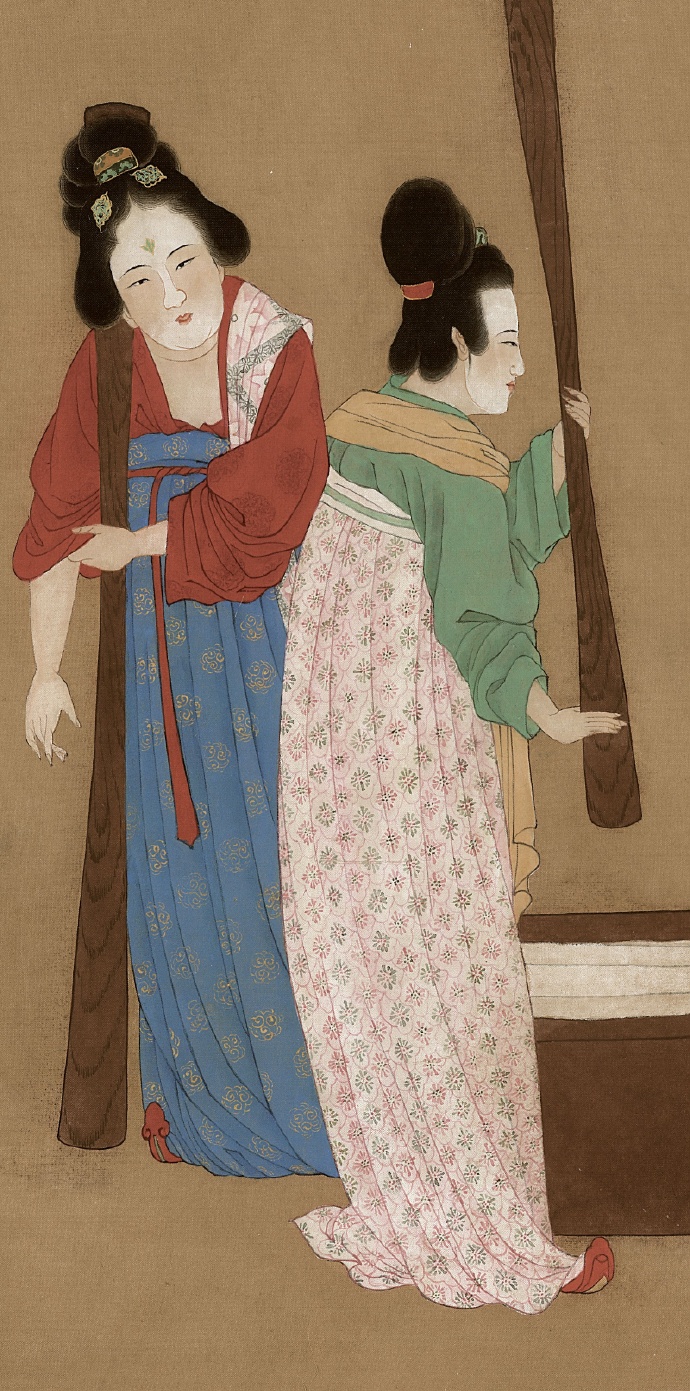 在仕女画发展的早期——汉魏晋时期,画家笔下的仕女多是秀骨清相,薄衣广袖。在这一时期绘画理论著作中称仕女画家为“青工绮罗”。到仕女画发展到中期的唐五代时期,朱景玄在《唐朝名画录》中始有“仕女’”之称。画家创作的仕女形象也演变成张萱画中所描绘的形象,以求更加符合于当朝统治者的审美趣味。在唐代,精工仕女的画家有张萱、周肋等,张萱是周昉的的老师,其工细妍丽,代表了唐代仕女画的典型风格。但因时代久远,张萱的绘画作品多数都散佚无存。现存的《捣练图》卷、《虢国夫人游春图》卷和《唐后行从图》虽或为后人摹本,但仍可令人窥见其绘画技艺之一斑。