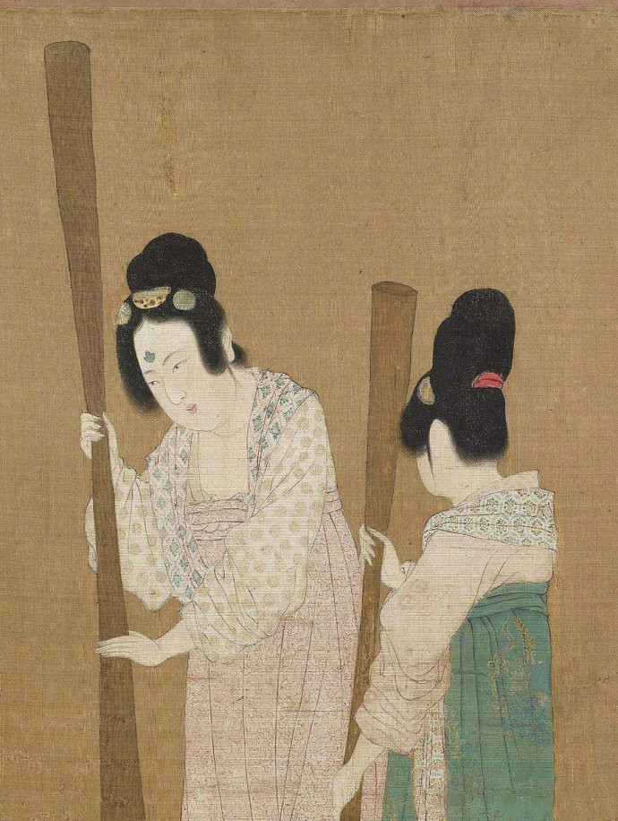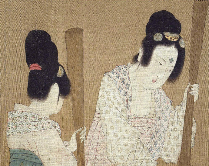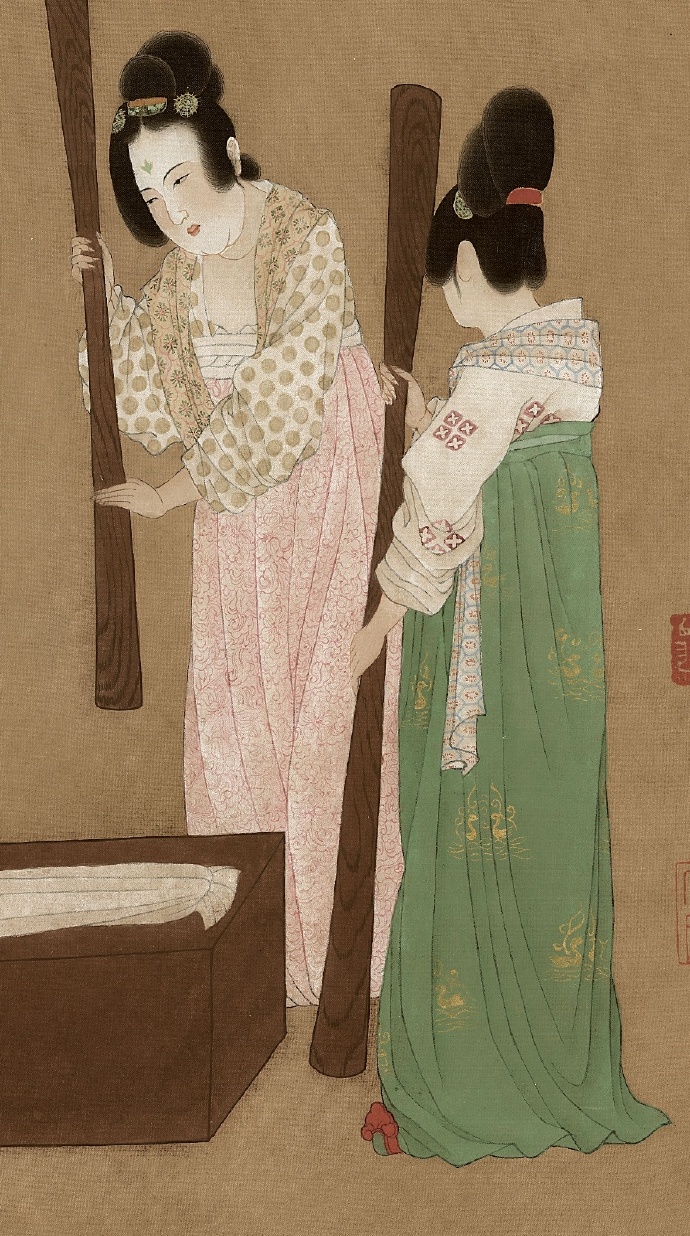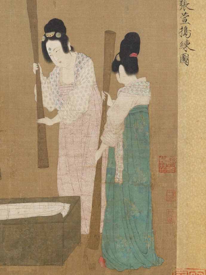 《捣练图》系唐代画家张萱之作。此图描绘了唐代城市妇女在捣练、络线、熨平、缝制劳动操作时的情景。画中人物动作凝神自然、细节刻划生动,使人看出扯绢时用力的微微后退后仰,表现出作者的观察入微。其线条工细遒劲,设色富丽,其“丰肥体”的人物造型,表现出唐代仕女画的典型风格。