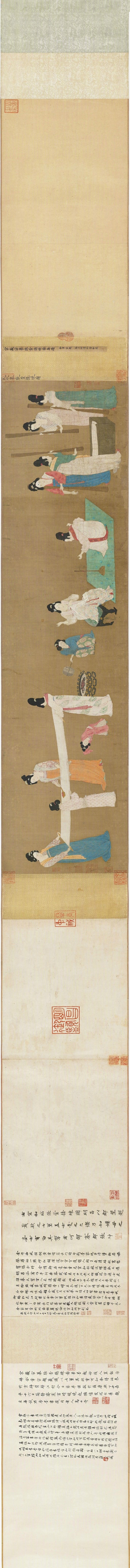 张萱(公元8世纪)〔唐〕京兆(今陕西西安)人,生卒年不详。玄宗开元十一年(723)与杨升、杨宁同时任史馆画直。工画人物,以擅绘贵族妇女、贵公子、婴儿、鞍马名冠当时。所画妇女惯用朱色,晕染耳根为其特色。又善以点簇笔法,画亭台、树木、花鸟等宫苑景物,点缀妍巧,俱穷其妙。尝以“金井梧桐秋叶黄”之句画《长门怨》,甚有思致。画迹有《明皇纳凉图》《整妆图》《卫夫人像》等47件,著录于《宣和画谱》。传世作品有《捣练图》卷(为赵佶摹本),现藏美国波士顿美术馆;《虢国夫人游春图》卷(为宋摹本),绢本,设色,纵51.8厘米,横140.8厘米,描绘杨贵妃之姊虢国夫人乘宫马春游之情景,人马、服饰尽得唐人风致,卷后有王铎题跋,现藏辽宁省博物馆。从艺活动约在开元、天宝年间。