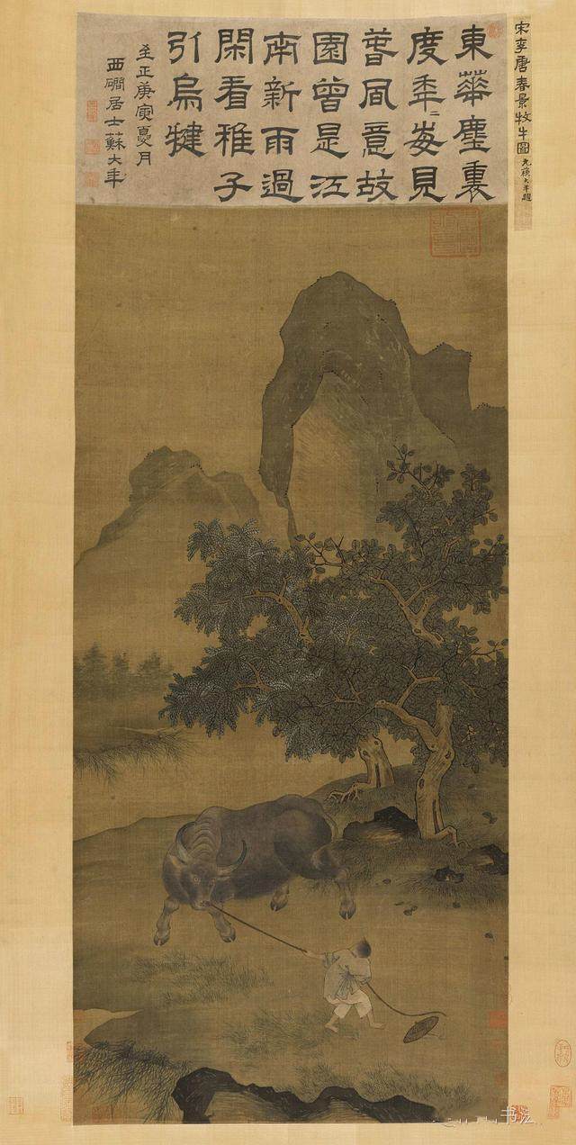 苏大年(款)题诗堂:东华尘里度年年,每见春风意故园。曾是江南新雨过,闲看稚子引鸟犍。至正庚寅夏月,西磵居士苏大年。