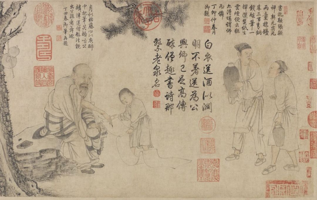 苏轼 (1037–1101)跋语:人人送酒不曾沽,终日松间挂一壶;草圣欲成狂便发,真堪画作醉僧图。