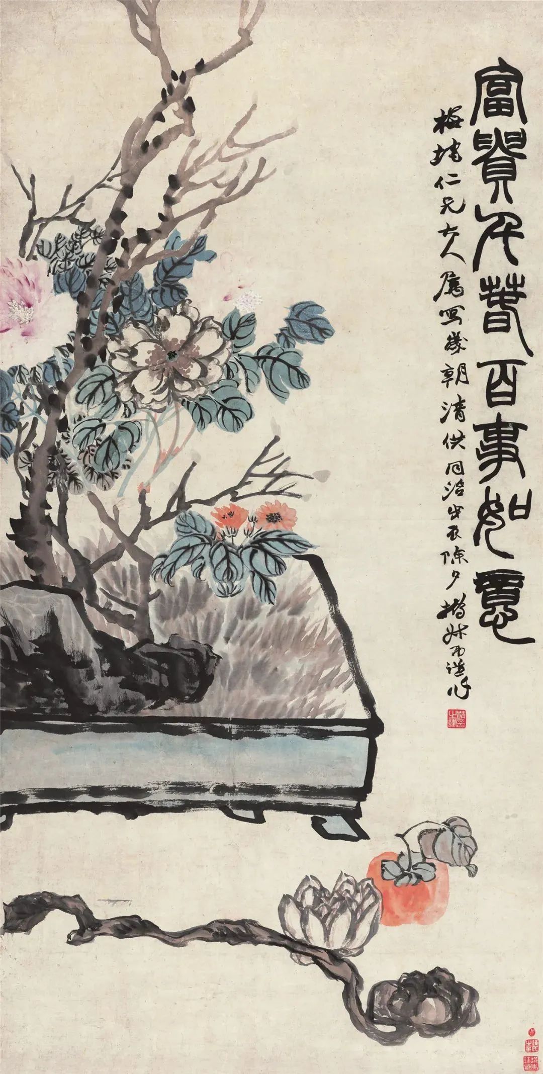 从此幅《岁朝清供图》来看,赵之谦将清代两大花鸟画派,即恽寿平的没骨画法与扬州画派的写意画法相结合,并自出机杼,创造出新的风格。他在金石书法方面功力深厚,并将其入画,注重用色,在用色上讲究雅俗共赏,突破了古代文人画家所秉承的“夫画道之中,水墨为上”的原则。这些特点在海派大家吴昌硕那里得到了继承与进一步发挥。可以说,赵氏在写意花鸟画艺术上的拓展与推进,对近世花鸟画影响颇为深远,齐白石、陈师曾等北派巨匠同样受过他画作的影响。
