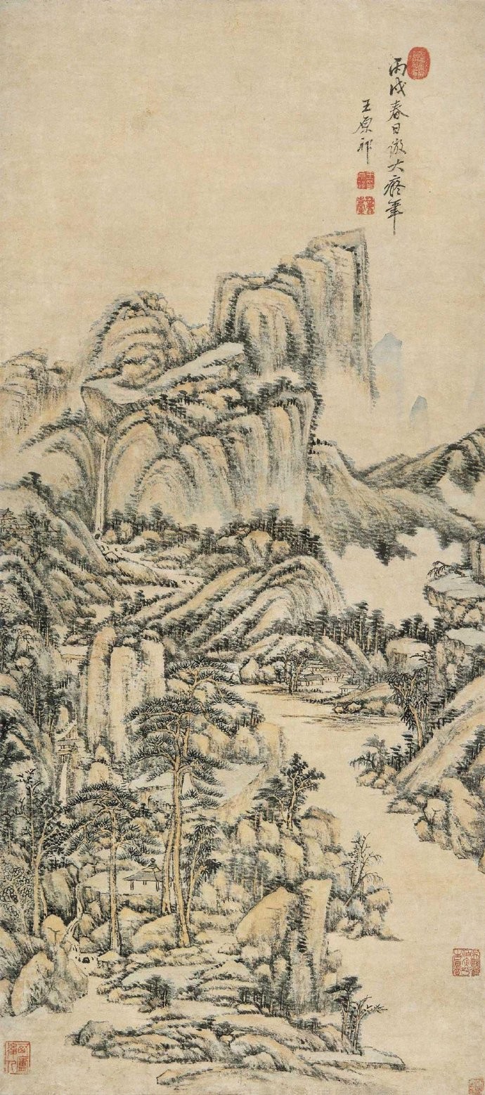 王原祁的山水画承袭家学,且尊崇并实践了董其昌所提倡的远宗董源、巨然之意境,近法黄公望、倪瓒之笔墨的理论。纵观王原祁一生的创作,大致以仿学董氏所言“南宗”画派诸家为主,而仿倪瓒、黄公望之作品尤多。原祁学倪瓒,以追求其山水画中“峰峦浑厚,草木华滋”的境界为圭旨,中年仿其迹而得秀润之态,晚岁得其意乃具苍浑之貌。创作笔墨已臻于平淡天真,虽云学倪,取其意而已,更兼得吴镇、黄公望之韵,画作饱满的构图、雄浑的气势、深幽的意境以及山石的皴法都源于倪瓒,而生拙的用笔和多层皴染的画法则流露出作者“熟不甜,生不涩,淡而厚,实而清”的自家面貌。是其晚年融汇诸家,自成一格的典型画作。