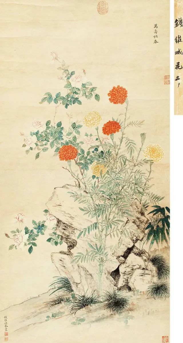 钱维城擅长山水画,他的花卉画亦很有名,但留世画作较少。此幅《万寿恒春》图为其花卉代表作。此幅画构图饱满,色彩明快,图中菊花与月季跃然于灵石上,几颗青竹伴于灵石旁。图中所绘之花朵枝叶刻画极为精细,如图中之菊花,枝叶先勾边线,再施以淡雅的绿色,气质清丽。勾花点叶,技法纯熟,所以《清史稿》卷504说他的“花卉传色尤有神采”。