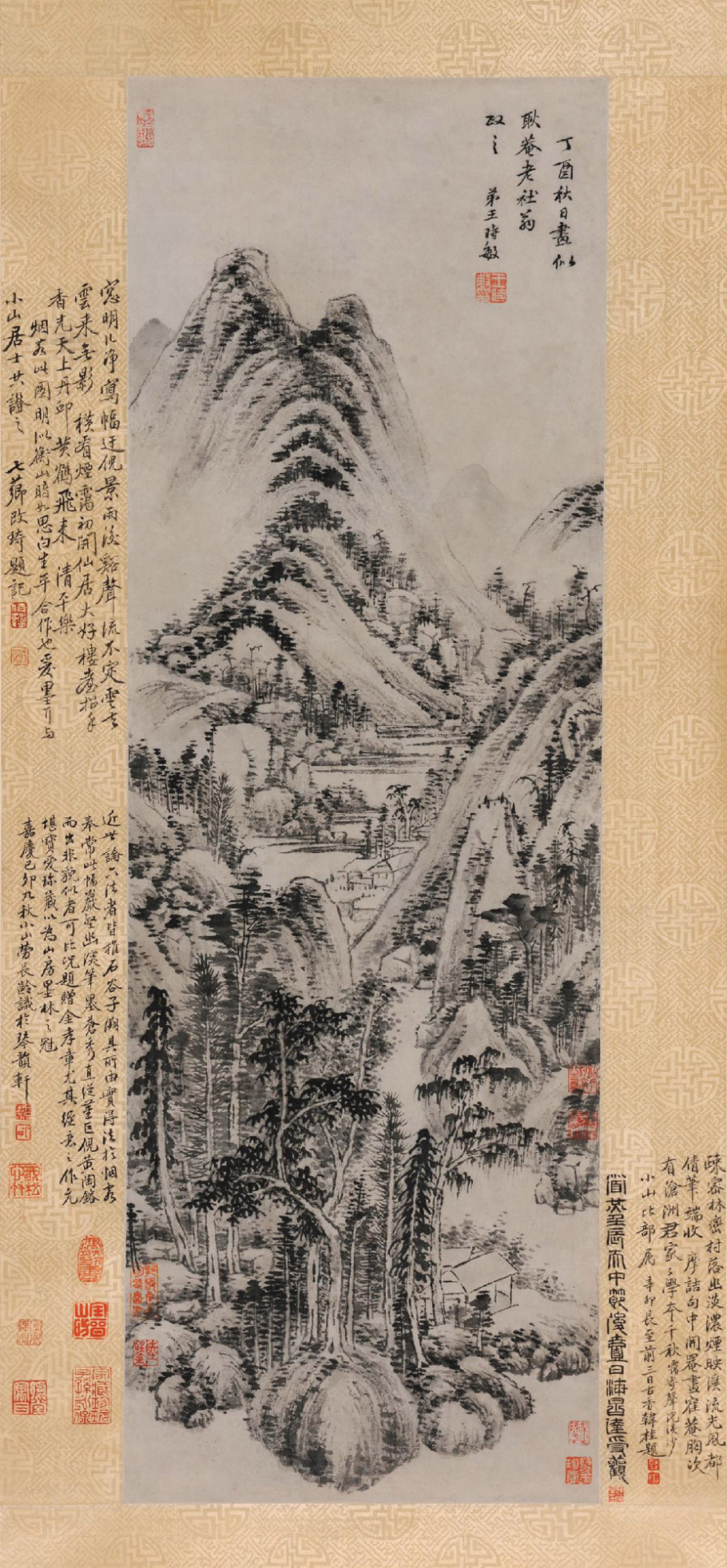 劳长龄题跋:近此论六法者,皆推石谷子。溯具所由实得法于烟客,奉常此幅巖壑幽涋,笔墨苍秀,直追董巨倪黄。陶镕而出,非貌似者可比。况题赠金孝章,尤其经意之作。元堪宝爱珍藏以为山房墨林之冠。嘉庆己卯秋小山劳长龄识于琴韻轩。钤印:长龄、貌松心林