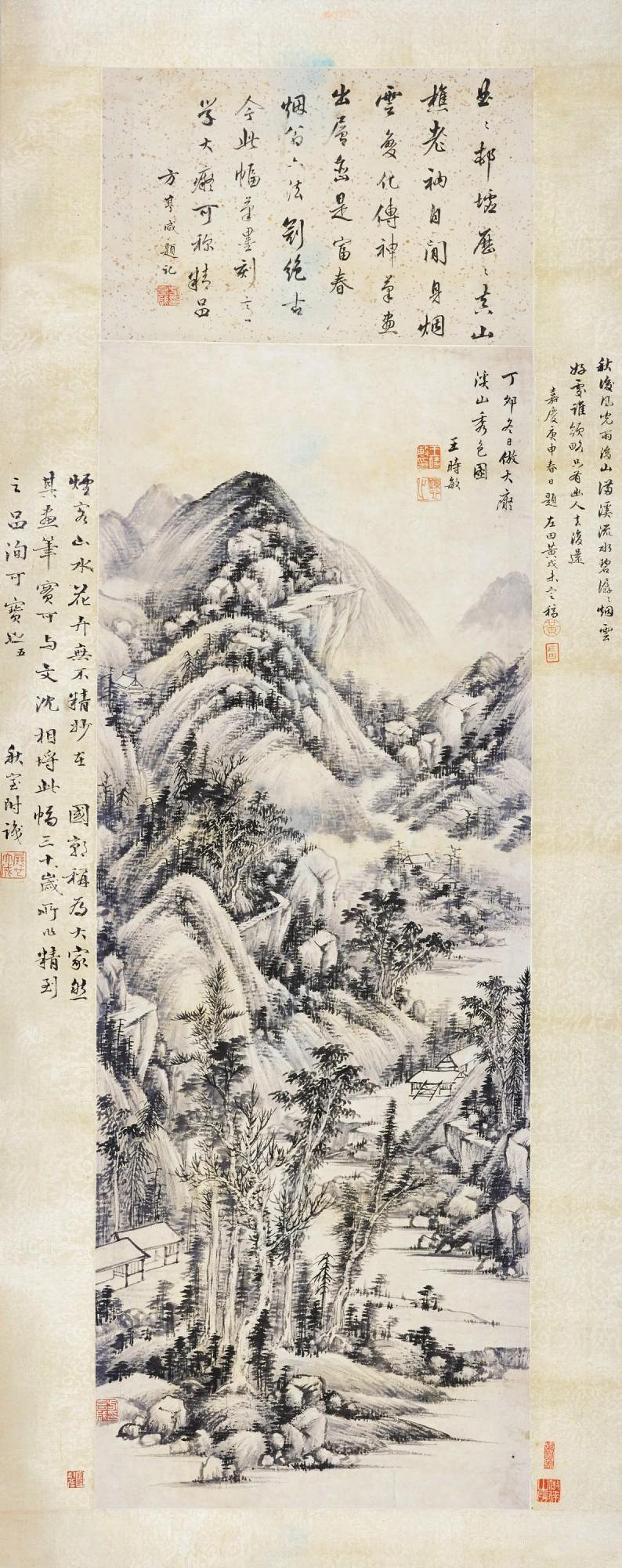 王时敏少时即聪慧伶俐,《国朝画征录》中就有记载:“姿性颖异,淹雅博物,工诗文,善书法,尤长于八分,而于画有特惠。”于是其祖父就嘱托董其昌来指导王时敏。在董其昌的指导下,他少年就开始从摹古入手,深究传统画法,对黄公望,刻意追摹。由于家里古书、名画收藏丰富,且大都是名迹,像当时很少传世的李成的画他都能够见到,这对他的影响是深远的。 此作题“丁卯冬日仿大痴溪山秀色图,王时敏。”。由此题款可知,这是画家仿黄公望之作。画家绘高山逶迤、苍松秀健。画面重峦叠嶂,主峰高耸,烟岚浮绕,林木葱茏,瀑布飞流;在各山岭之间,房屋、宅院若隐若现,可游可居。近景山坡上,苍松挺立。整幅作品构图繁复,行笔缜密,水墨淋漓酣畅,云气升浮,生动地描绘了清润自然的山间林野景象。王时敏的山水画主要学元代黄公望,讲究用笔的含蓄和松秀。王时敏在此图中的笔法、山石结构,颇近黄公望;但繁密的树木、层层叠叠的山峦,又近于王蒙。王时敏一生注重师法宋元诸家,并将各家融会贯通,形成了自己的绘画面貌。其作品构图完整,笔墨浑厚苍润,层次丰富,墨色浓淡相宜,效果清新、优雅、自然。秦祖永《桐阴论画》评王时敏:“运腕虚灵,布墨神逸,随意点刷,丘壑浑成。” 本幅经黄钺、方亨咸等人题跋,《溪山秀色图》为画家晚年所作,画面布置有序,层次井然,笔墨清隽秀润,沉静淡雅,毫无躁气,具有温厚而博大之美。王时敏早年多临摹古画,并且按照宋、元古画原迹进行临摹,故其此时的作品淡雅温润,工整精细,清润有余而苍茫不逮。他不仅以古法进行创作,而且还将它作为评判作品的标准,主张“论蹊径,宛然古人,而笔墨神韵,一一寻真”。王时敏中年多取法董其昌,笔墨皴染空灵,用笔细腻,运墨明净洒脱。晚年,王时敏则以黄公望为宗,兼取董源、巨然、王蒙等诸家,作品更多体现出苍劲浑厚之趣。70岁后,王时敏生活安定,得以潜心绘事,艺术上更是日臻妙境。